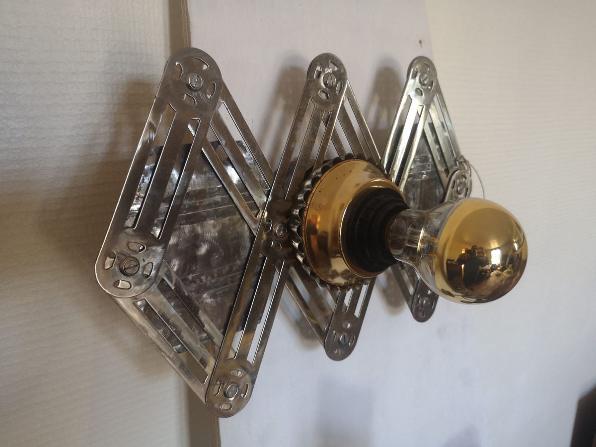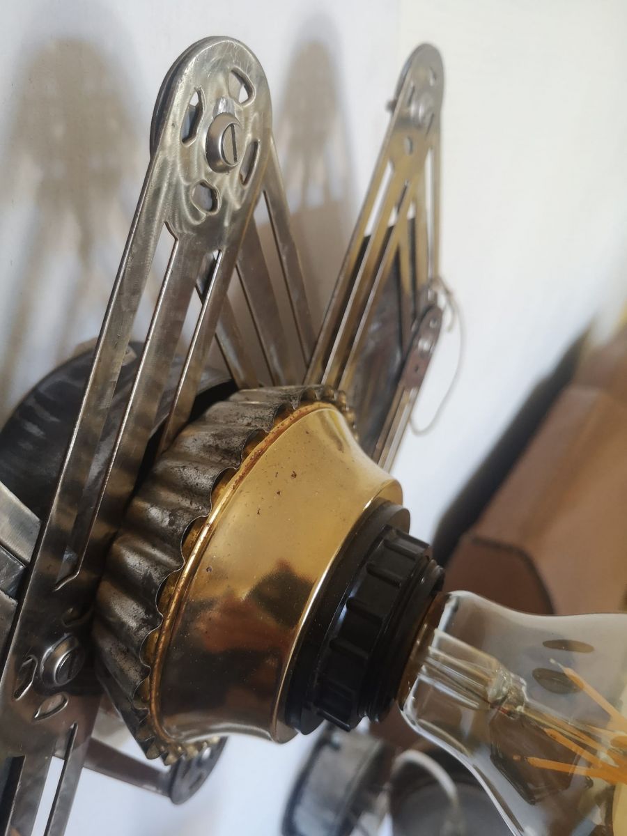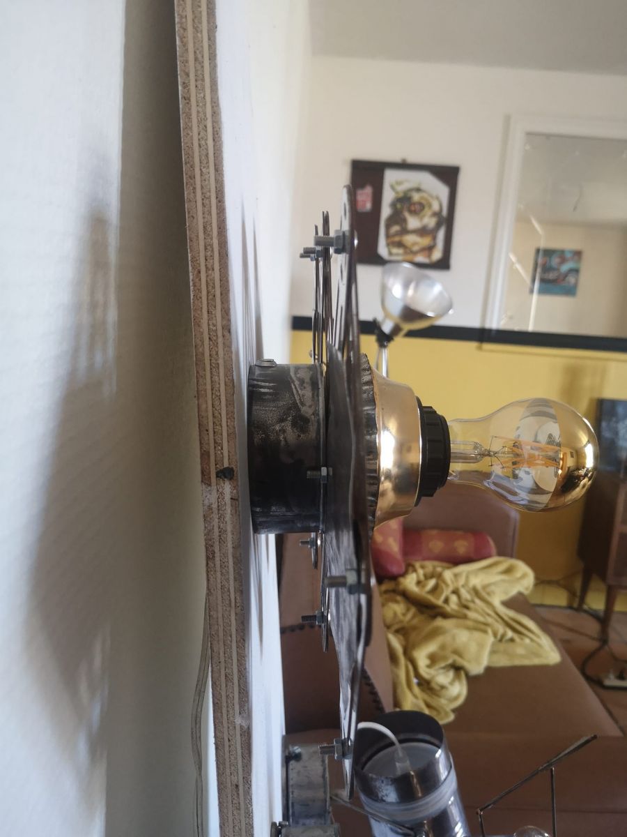 Dessous de plat ancien transformé en applique, socle en boite de conserve, support d'ampoule papille laiton et moule à tartelette en aluminium.