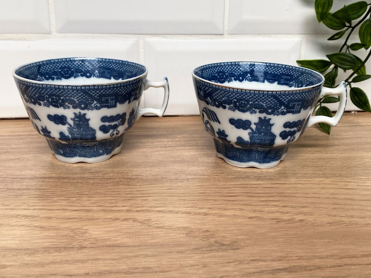 2 tasses à thé en porcelaine fine blanc bleu, filet or au buvant et anse. Porcelaine fine, presque transparente. Joli décor blanc bleu, bel état. Contenance 15 cl, diamètre du buvant 9,4 cm, hauteur 6,5 cm. V816