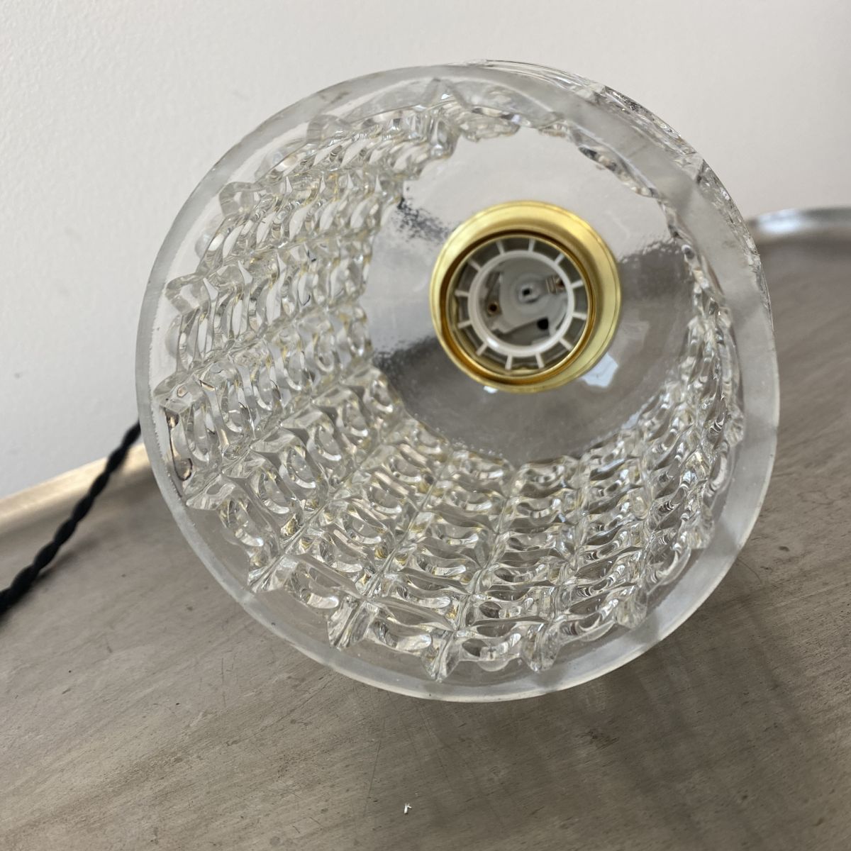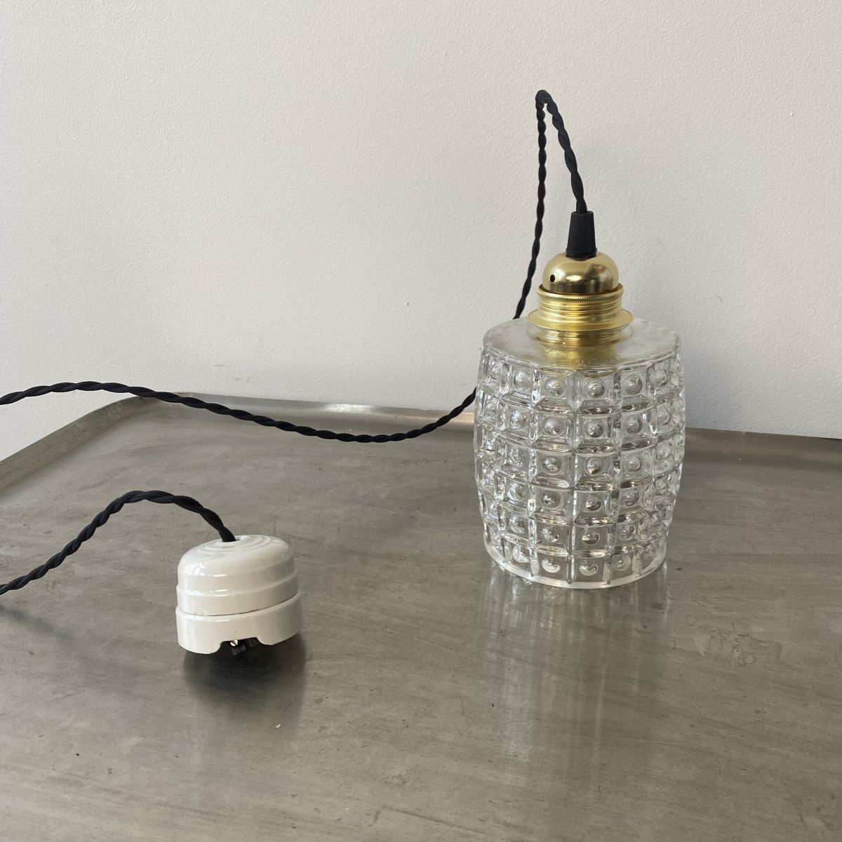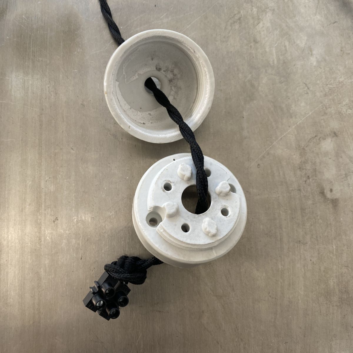 L’électricité a été refaite. Douille à vis gros culot (Ampoules E27). Branchement par domino. Fil noir en tissu tressé et rosace de fixation en porcelaine.