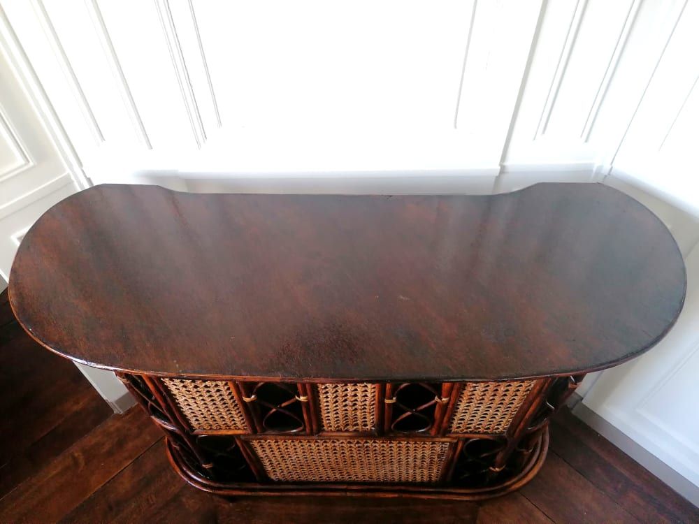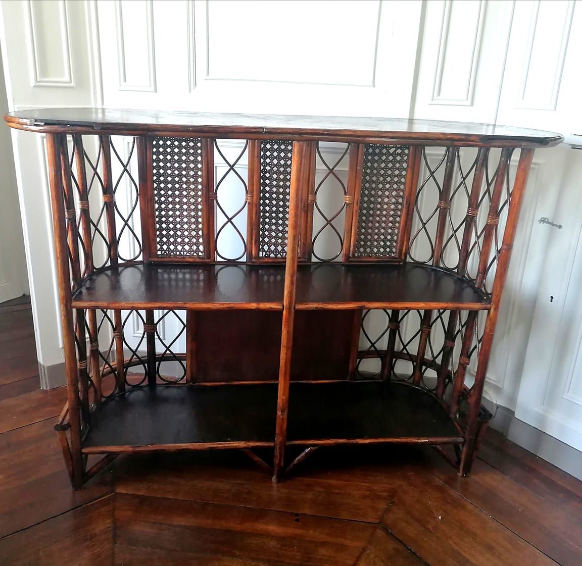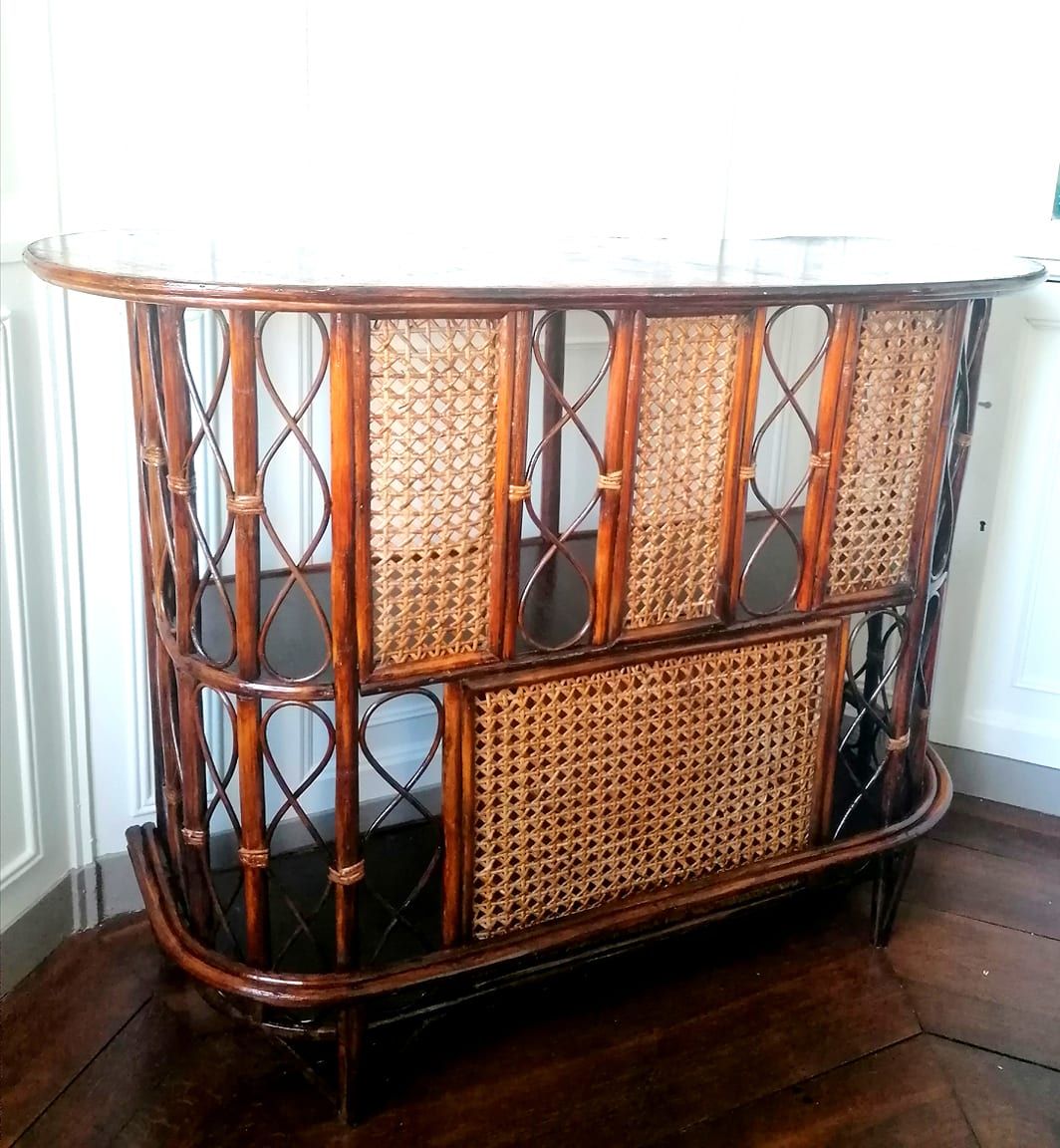 Grand bar en rotin et cannage. Décor d'entrelacs de bambous et cannage en façade.