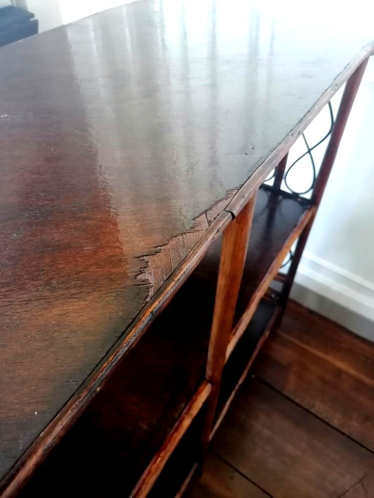 En très bon état général, à signaler: quelques traces d'usures et manques (manque dans le placage sur le plateau). A été totalement reverni, pièce stable et solide.