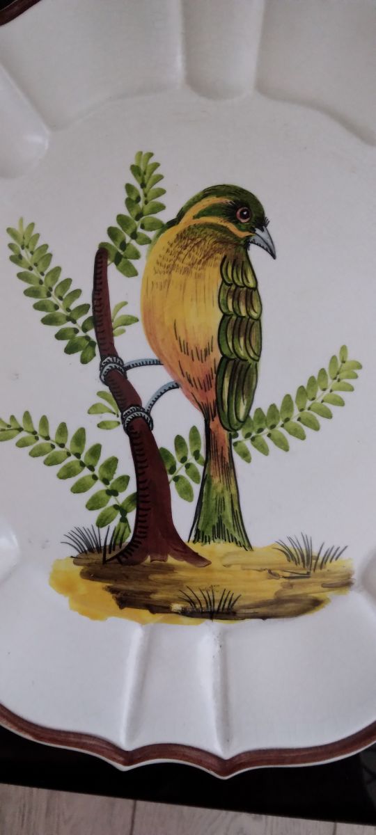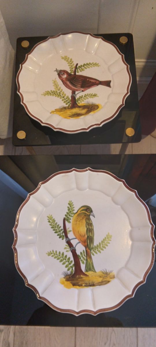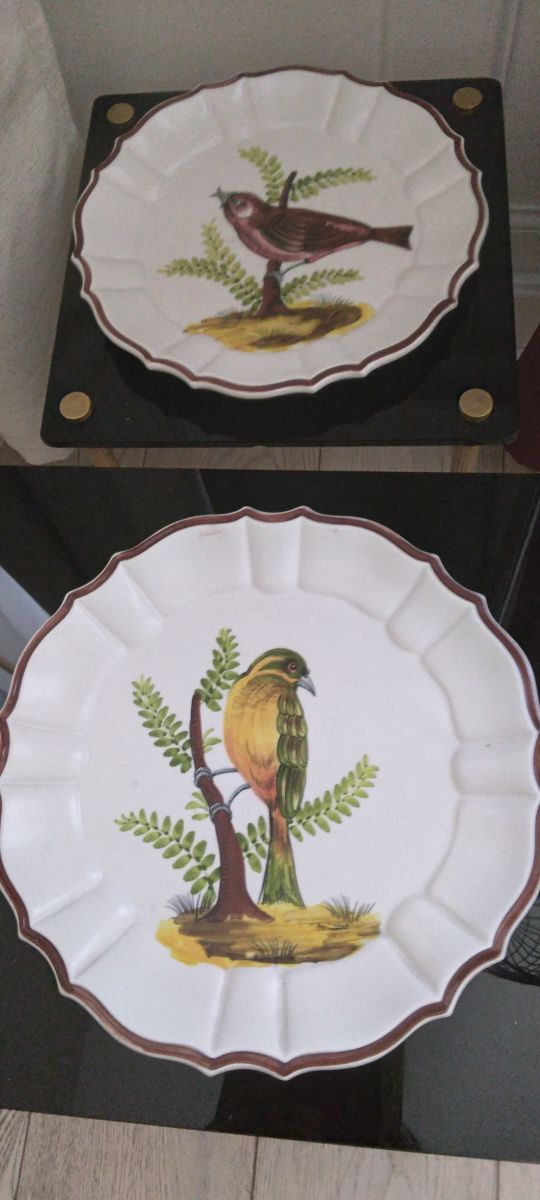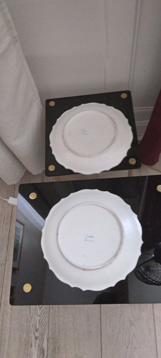 Ensemble de deux assiettes peint main estampillé Bassano ,52 cm de diamètres peuvent se fixé sur un mur .Le fond clair des assiettes sont craquelé.