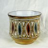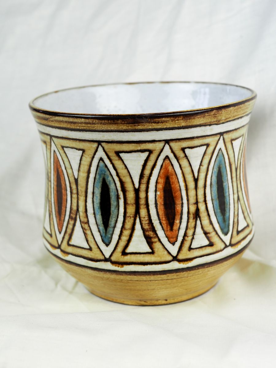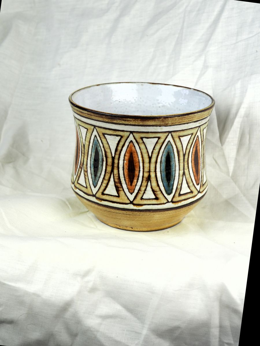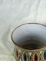 Vase / cache-pot à décor géométrique abstrait, fentes en nuances de crème, bleu, rouge et noir.