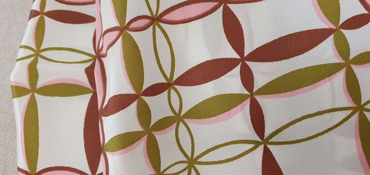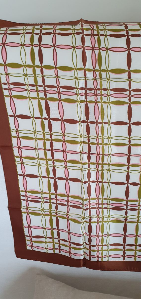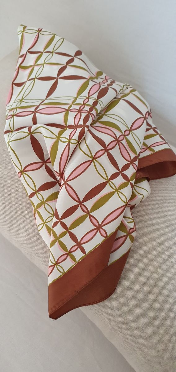 Foulard à motifs vintage rose, marron, vert, sur fond crème. Entourage marron.