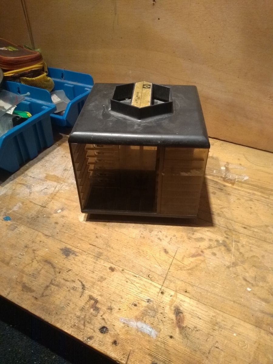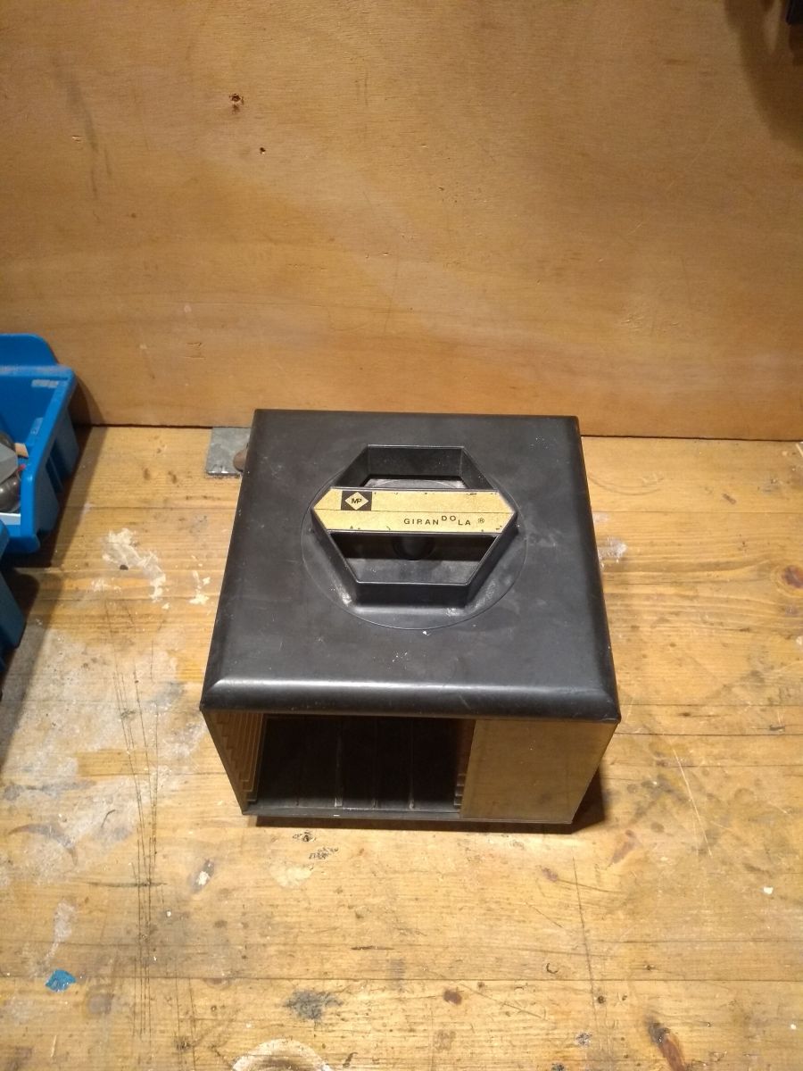 Marque : Bonjour je vends un support cassette disque compact Période : 1980 Marque : GIRANDOLA Matière : Plastique Coloris : Noir Dimensions : 16 / 16 / 16 cm Capacité : 20 K7 dans leur boîtier ou 32 K7 sans boîtier Le petit + : Tour pivotante et empilable Etat :