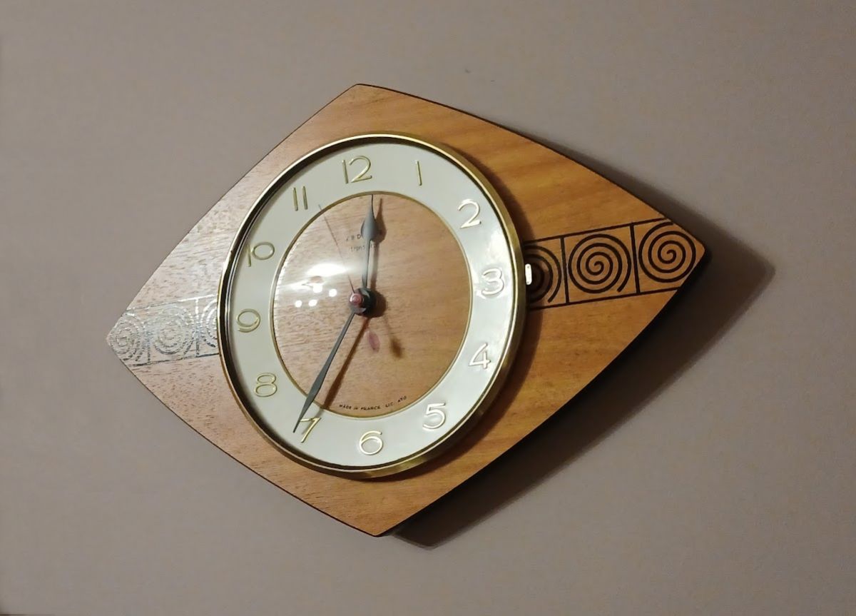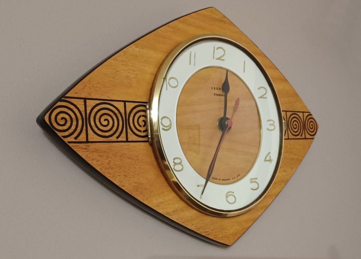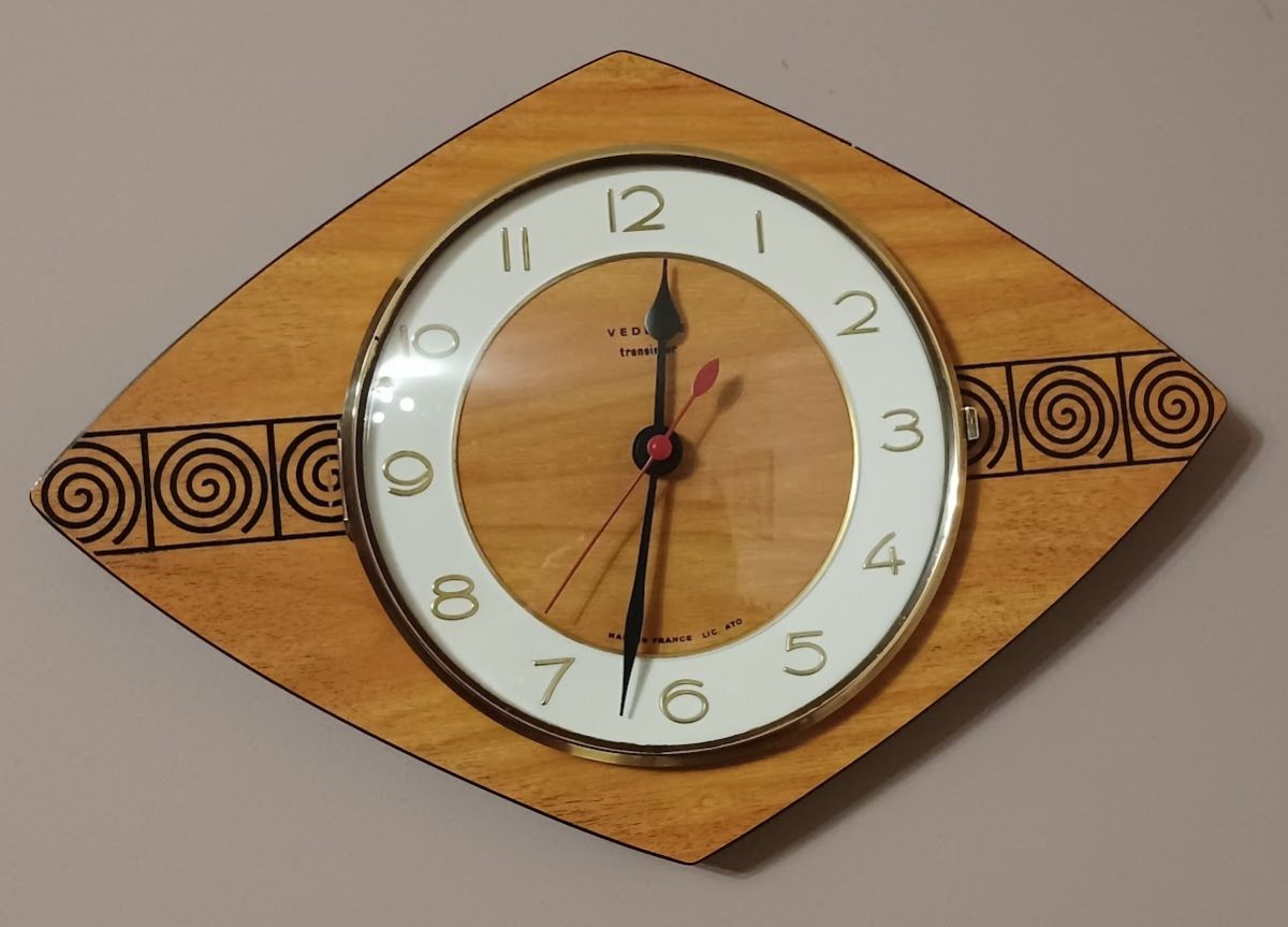 Entièrement restaurée (6h de travail). Elle fonctionne parfaitement avec son mouvement à pile. Son cadran propose une trotteuse rouge et aiguilles noires laquées, chiffres en laiton (très belle police fine et design). Il indique "Vedette transistor", "Made in France LIC ATO"). La lunette qui entoure la glace (vitre bombée circulaire de protection) est en laiton (fixation par des vis à tête fendue). Le système d'ouverture fonctionne parfaitement. Corps en formica boisé avec motif en spirale noir. Finition en formica noir sur la bordure. Prête à poser dans votre décoration de style vintage ou scandinave...