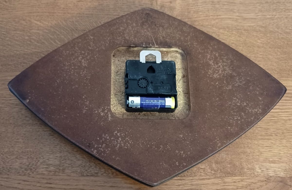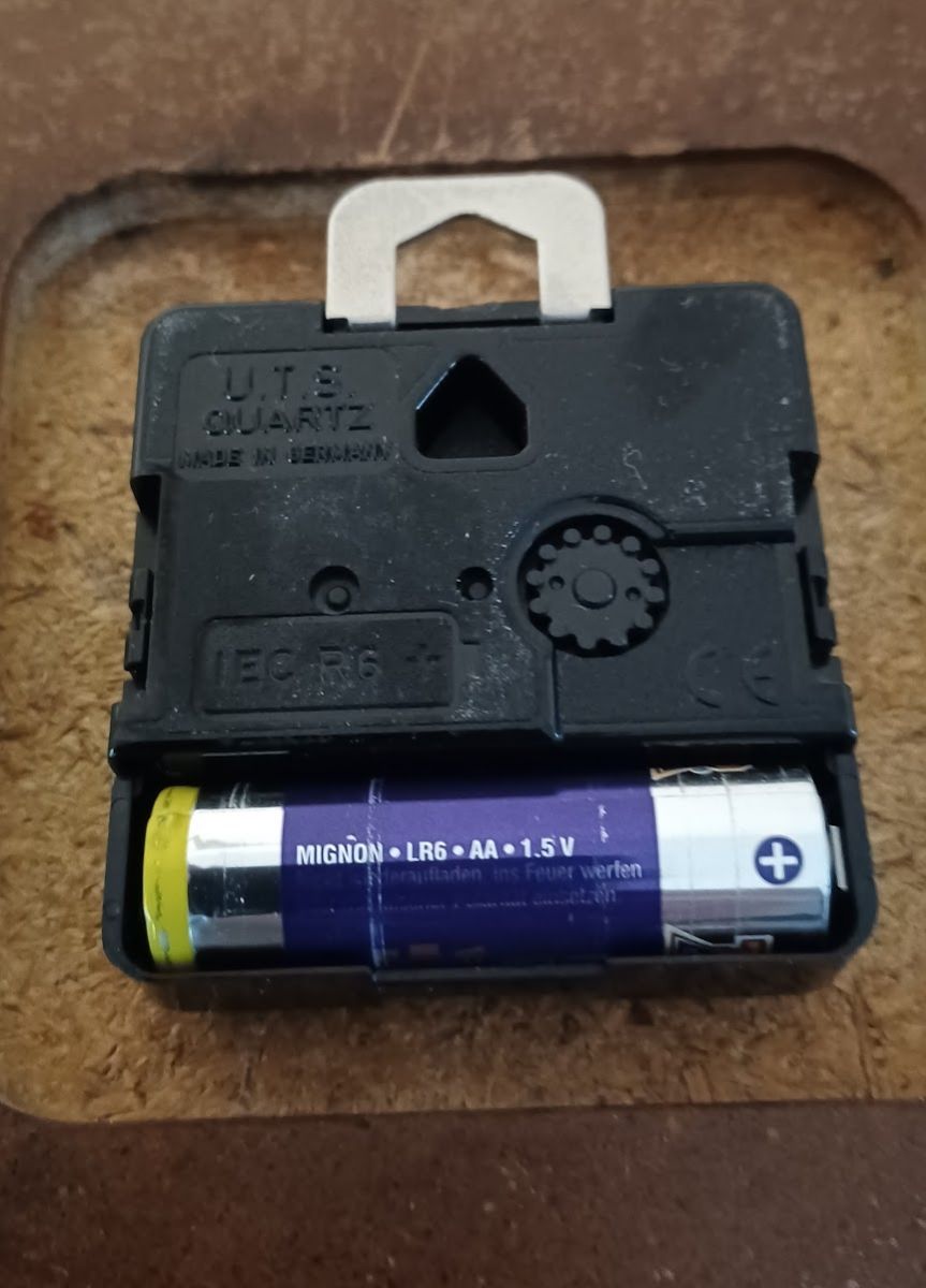 Cette horloge est équipée d'un Mécanisme de mouvement à Quartz de marque "U.T.S. QUARTZ Made in germany" "IEC R6 +" et "CE". Il ne s'agit donc pas du mécanisme d'origine. Le logo "poubelle barrée", mis en service en août 2005, n'apparaît pas, le mécanisme est donc antérieur. L'indication "IEC R6" indique la norme pour le type et la forme de la pile (IEC = International Electrotechnical Commission créée en 1906). Dans la classification IEC, les piles rondes étaient désignées pas un code de taille numérique avant 1990. Sur ce mécanisme la présence de "R6" indique qu'il faut utiliser des piles dîtes "Mignon" ou plus communément "AA". On pourrait donc croire qu'il est antérieur à 1990. Cependant, la marque CE (transformée depuis en marquage CE) est bien visible sur la droite et celle-ci est entrée en vigueur en 1993. Le mécanisme est donc plutôt de la fin du XXème siècle. Peut-être s'agit-il d'un remplacement de mécanisme en cours de vie.