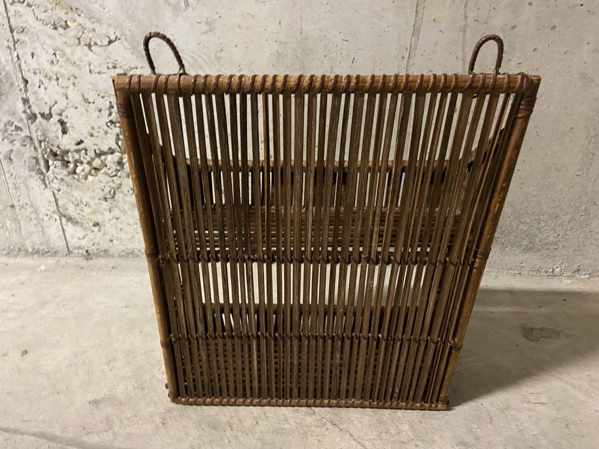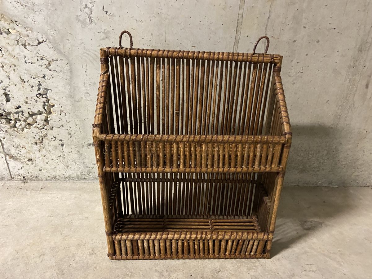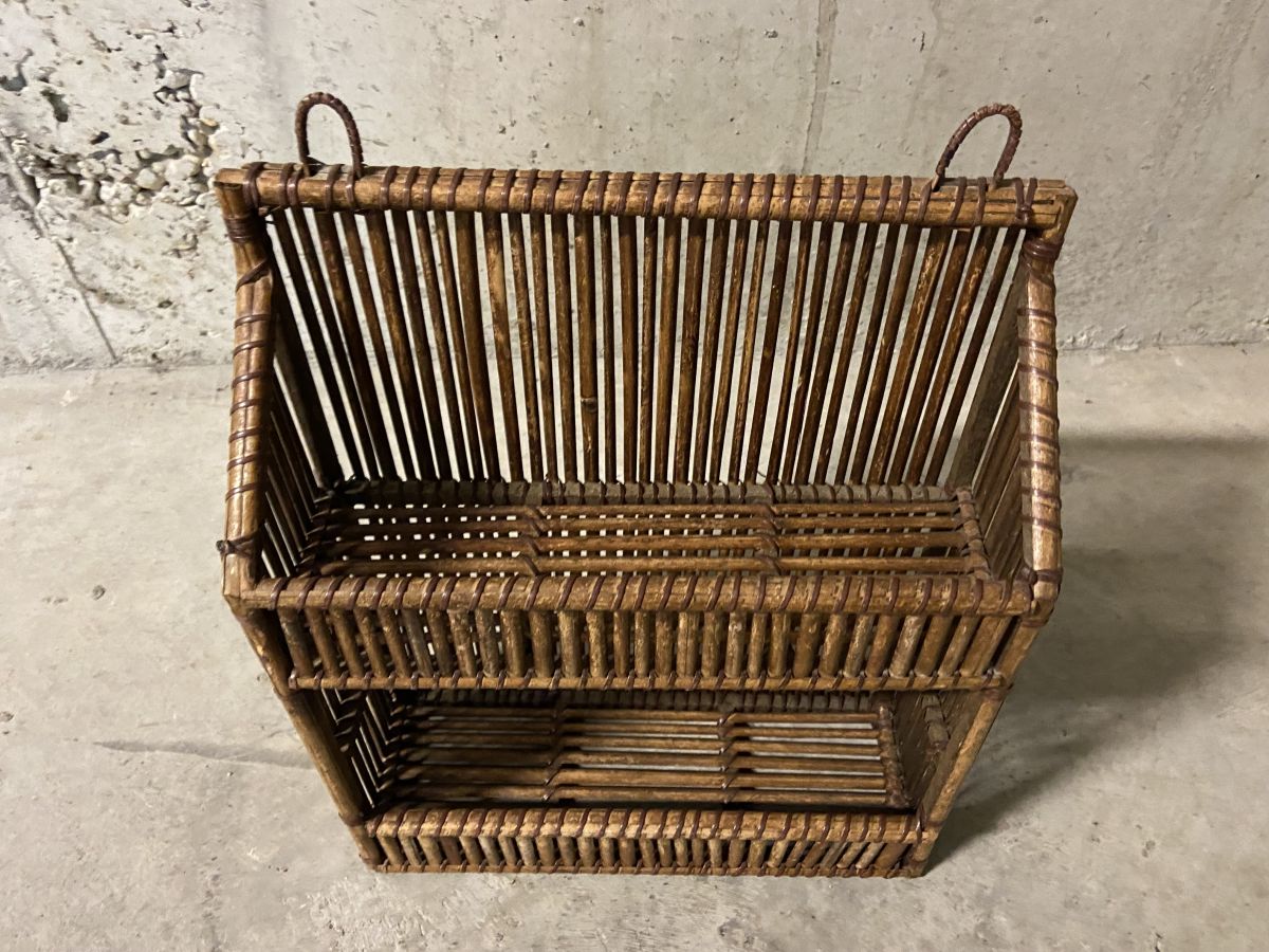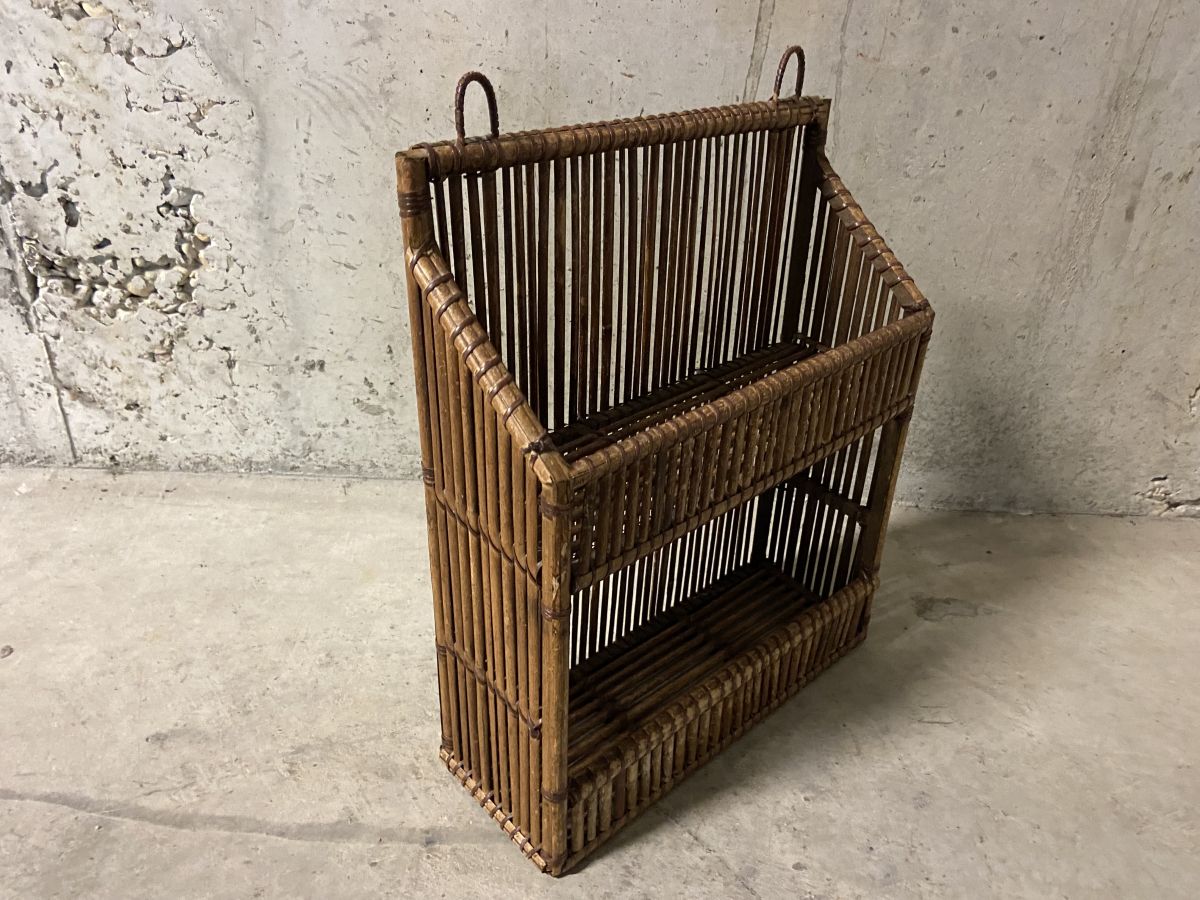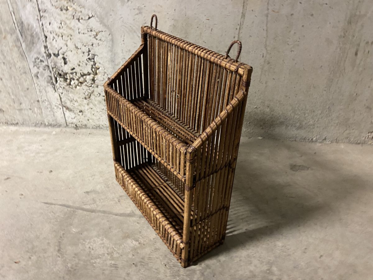 Petite étagère à épices des années 70 en rotin, 2 plateaux, 2 anneaux de suspension, traces d’usage, dimensions (cm) : L.30xH.36xP.10, bon état.