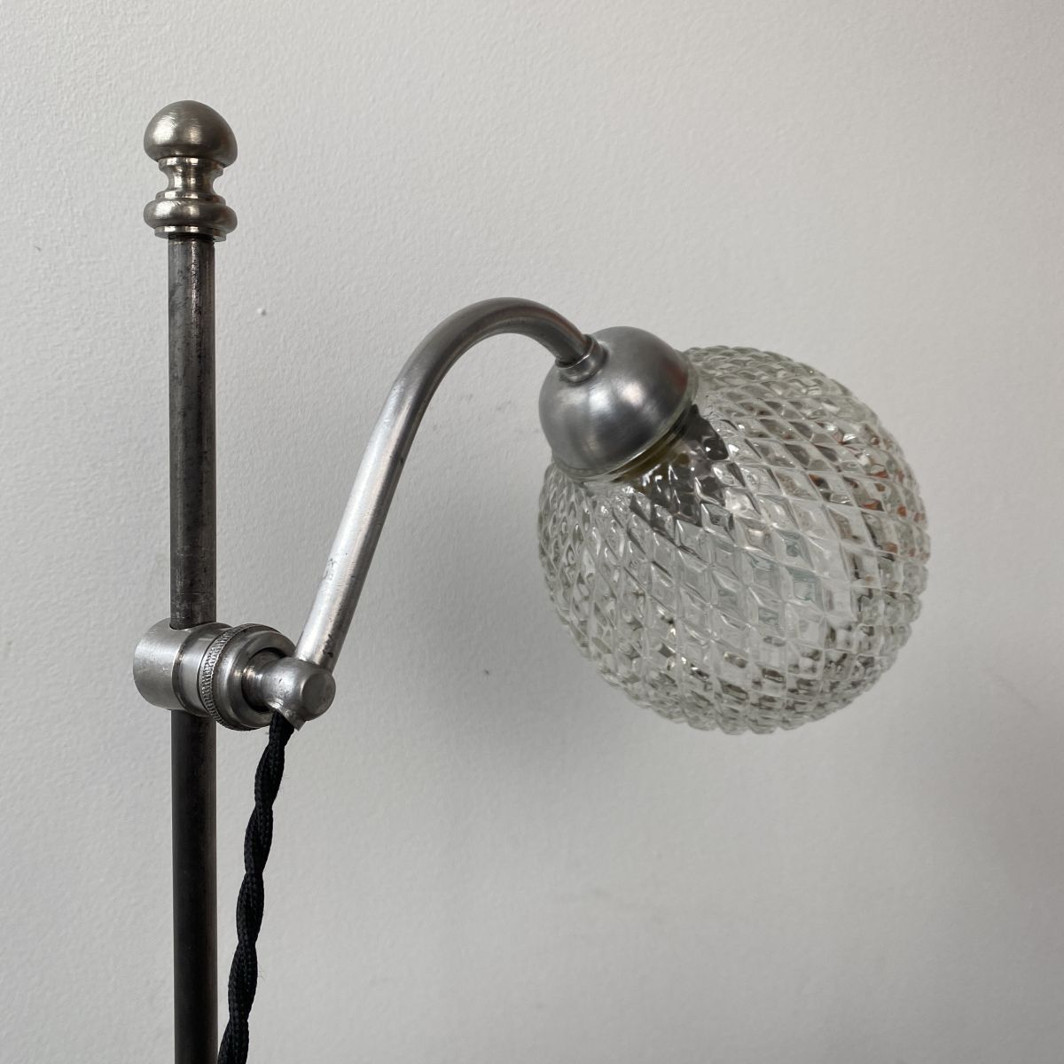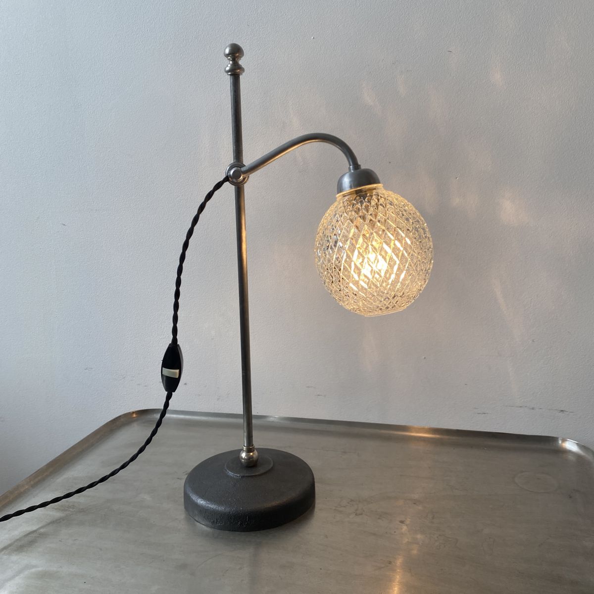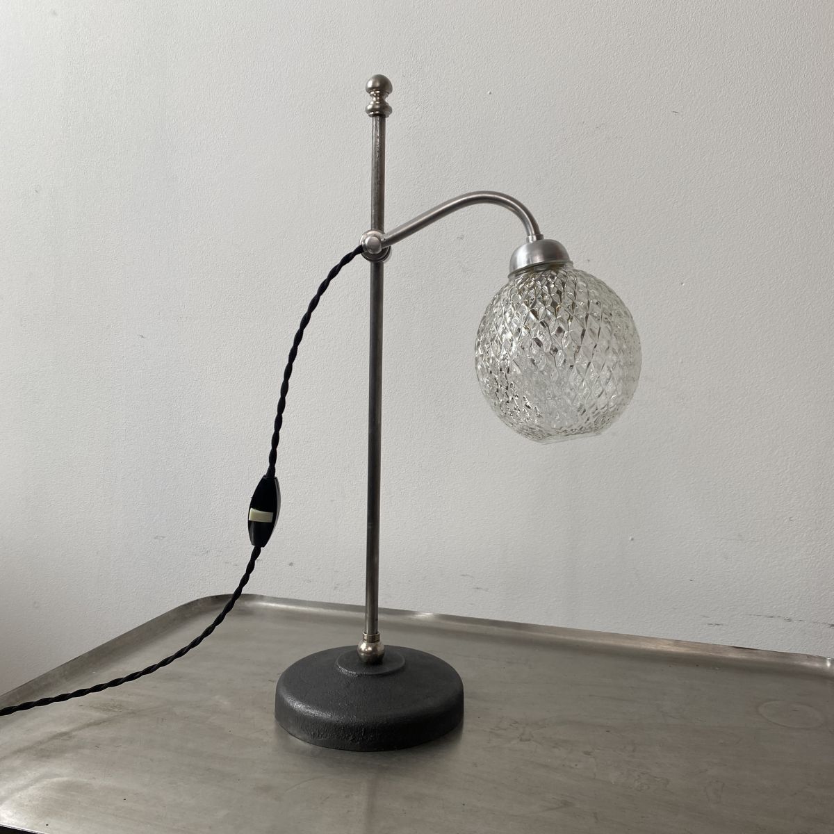 Lampe de bureau dîte « monte et baisse » des années 1950. Un bel abat-jour rond en verre moulé. Très belle lumière. Articulation du bras par rotule.