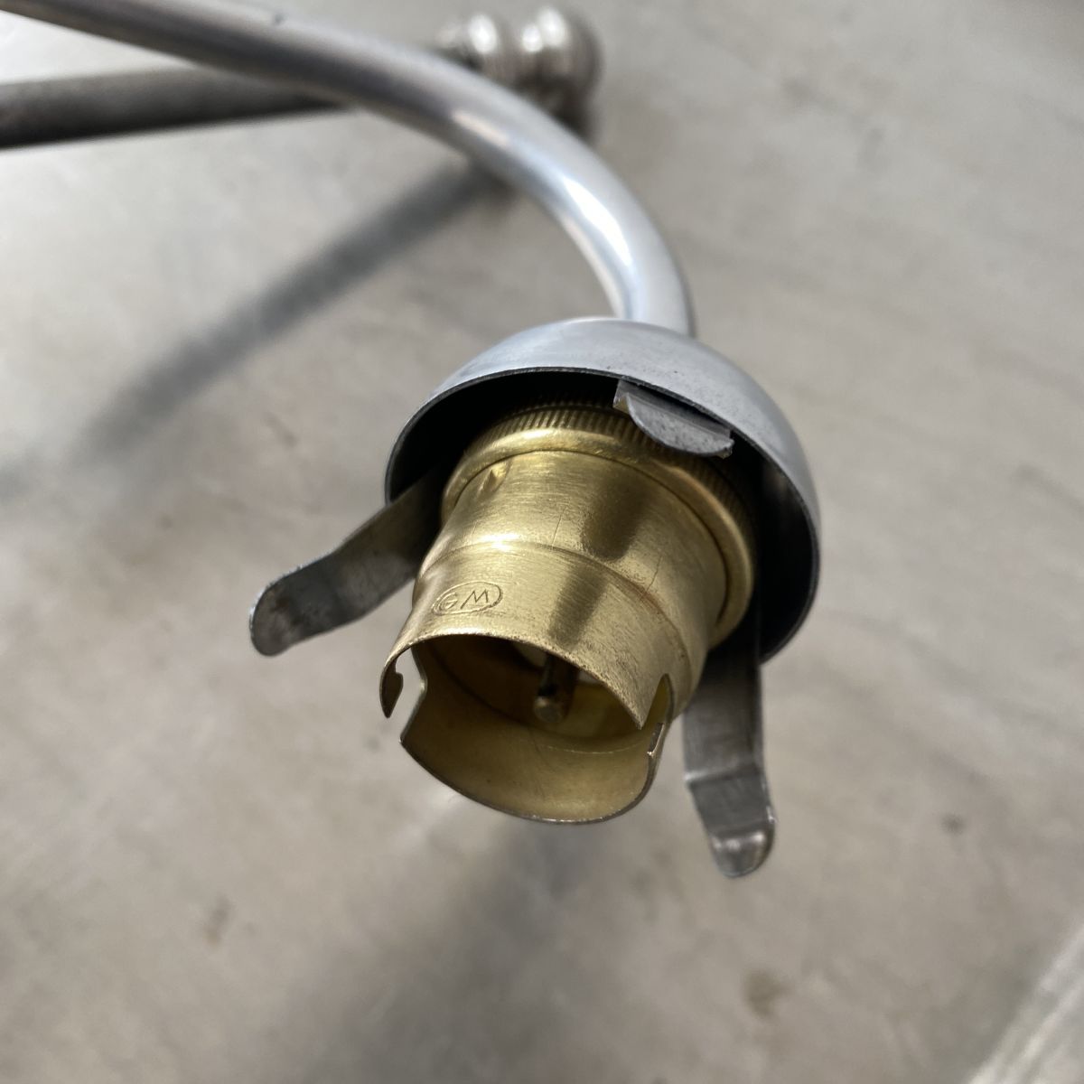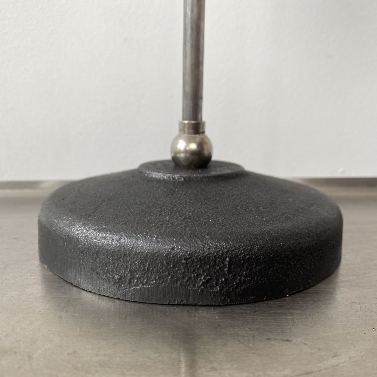Cette lampe a été démontée et nettoyée. La base et l’axe principal ont été patiné ton anthracite. Electricité refaite à neuf avec fil noir en tissu tressé. Interrupteur sur fil et douille à baïonnette (B22).