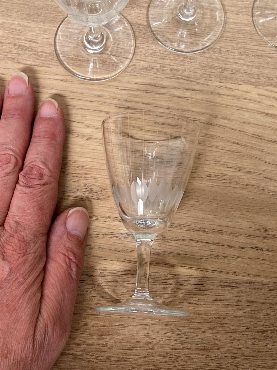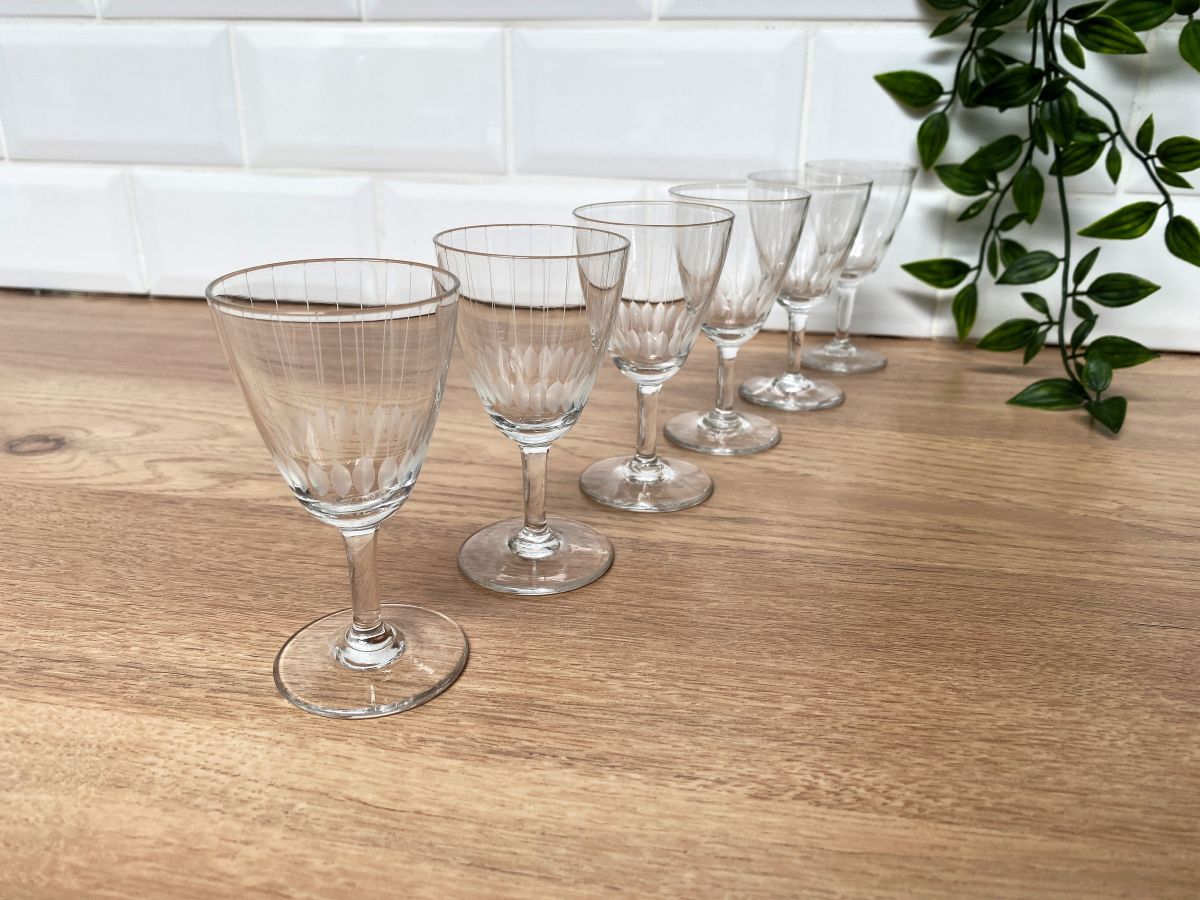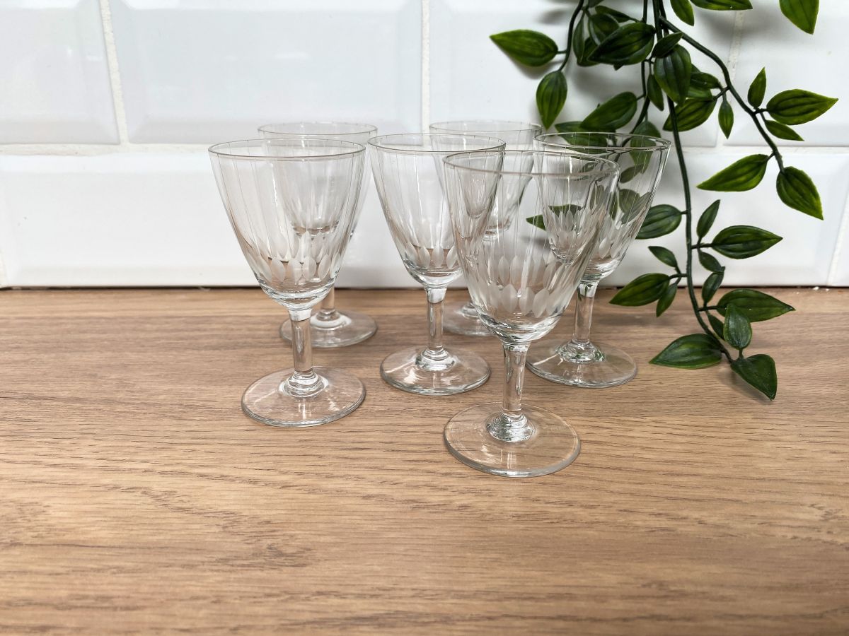 Set de 6 petits verres à liqueur ou à digestif, décor grain de riz en partie basse et lignes verticales sur le haut. Contenance 4 cl. Diamètre du buvant 5 cm, diamètre du pied 4,5 cm, hauteur 9,5 cm. Je possède 6 autres verres identiques dans une autre annonce, n'hésitez pas à me contacter pour un envoi groupé. V838