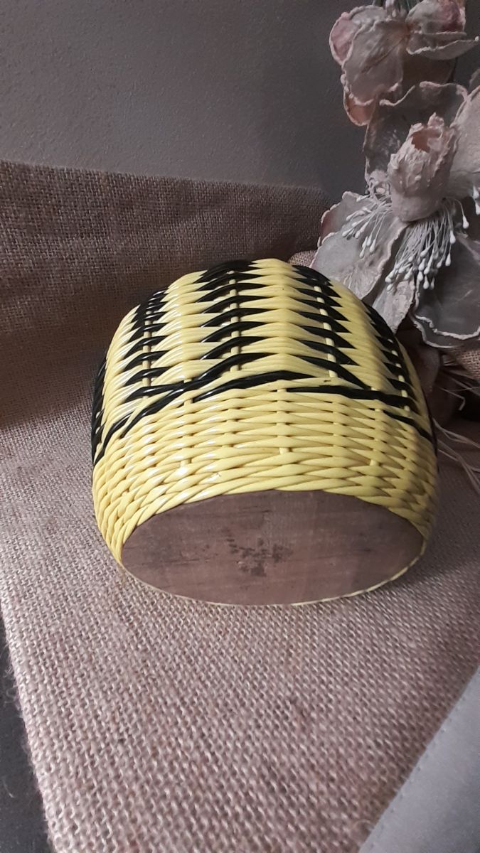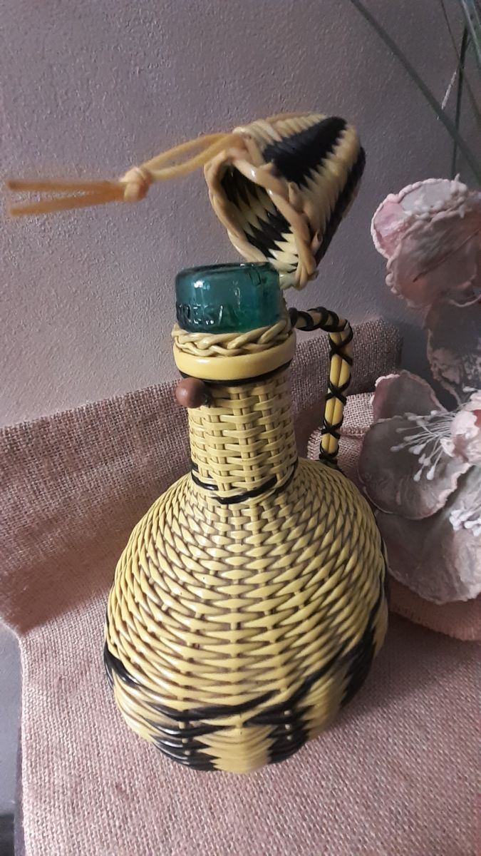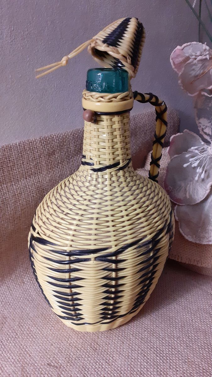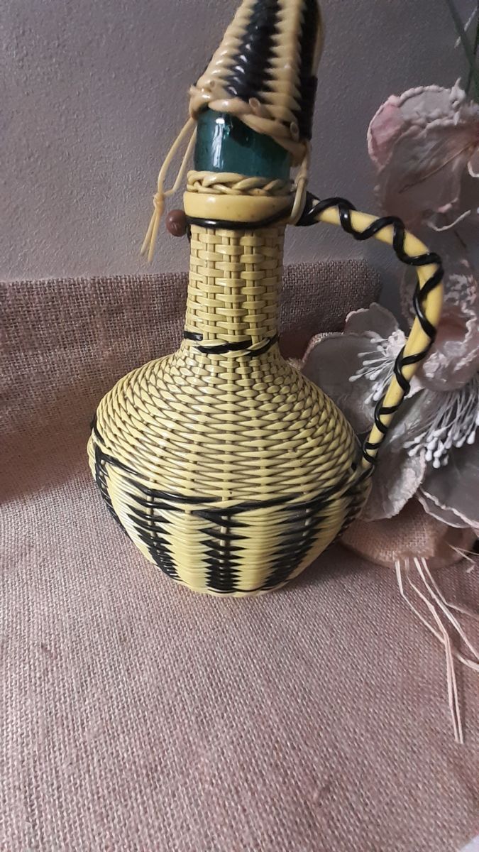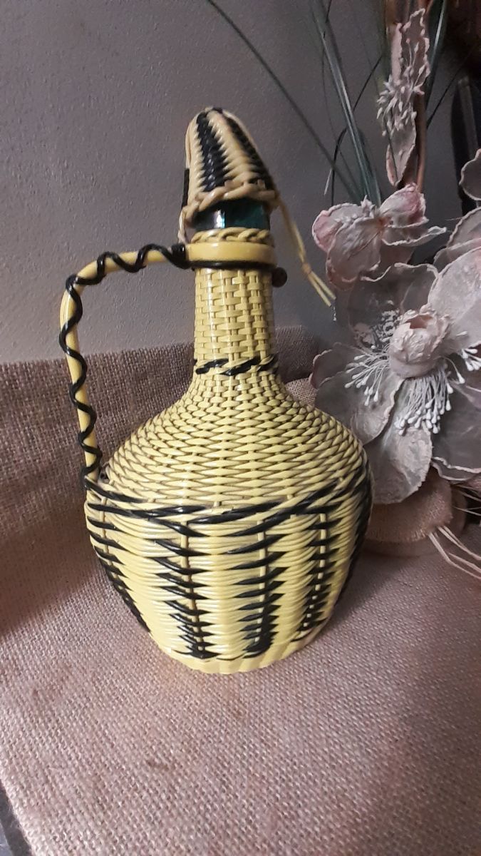 Très belle carafe vintage tressée en plastique scoubidou. Viresa. Jaune et noir. Hauteur 26.5 cm environ largeur 16 cm.