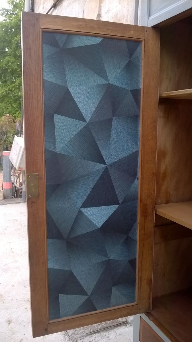 le fond et les porte intérieur on été tapissé d un papier polygone bleu.