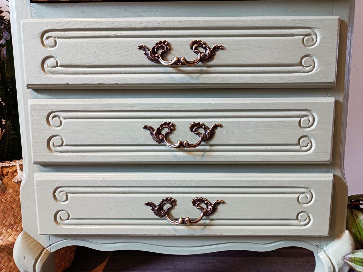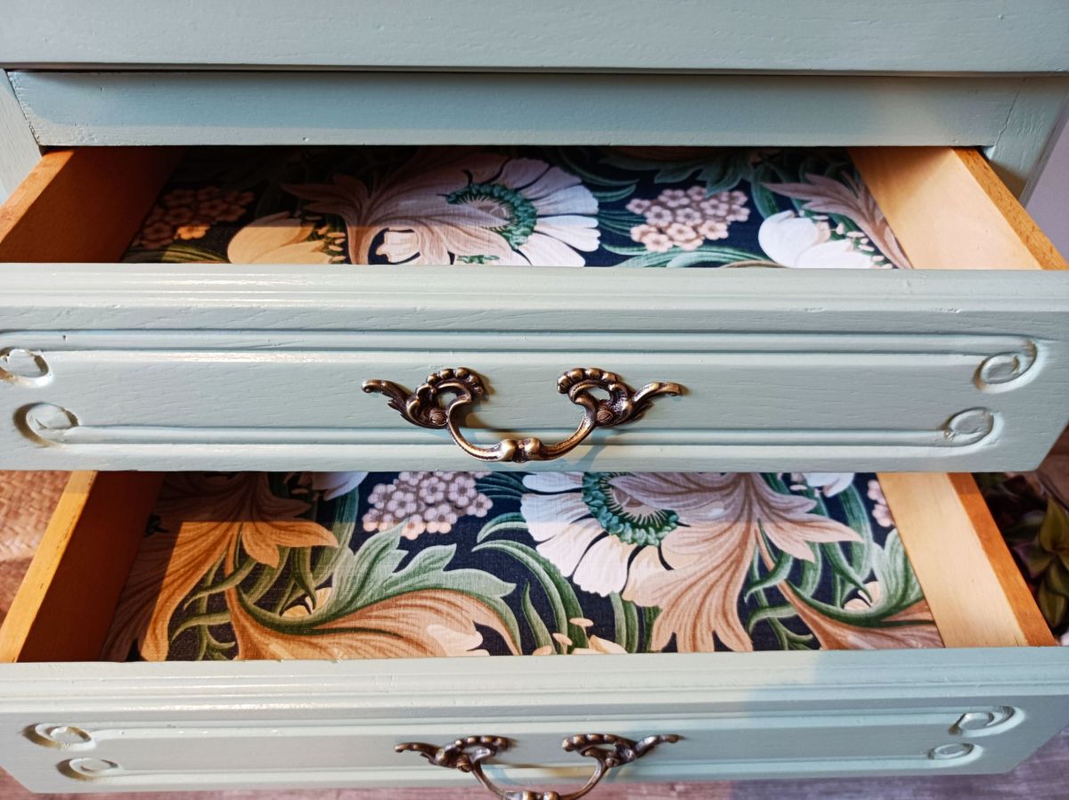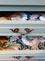Le papier peint choisi pour les tiroirs donne à l’ensemble un coté romantique. L’intérieur en bois clair propose un bel espace de rangement, avec 2 compartiments originaux et un petit tiroir pour ranger tous ses secrets.