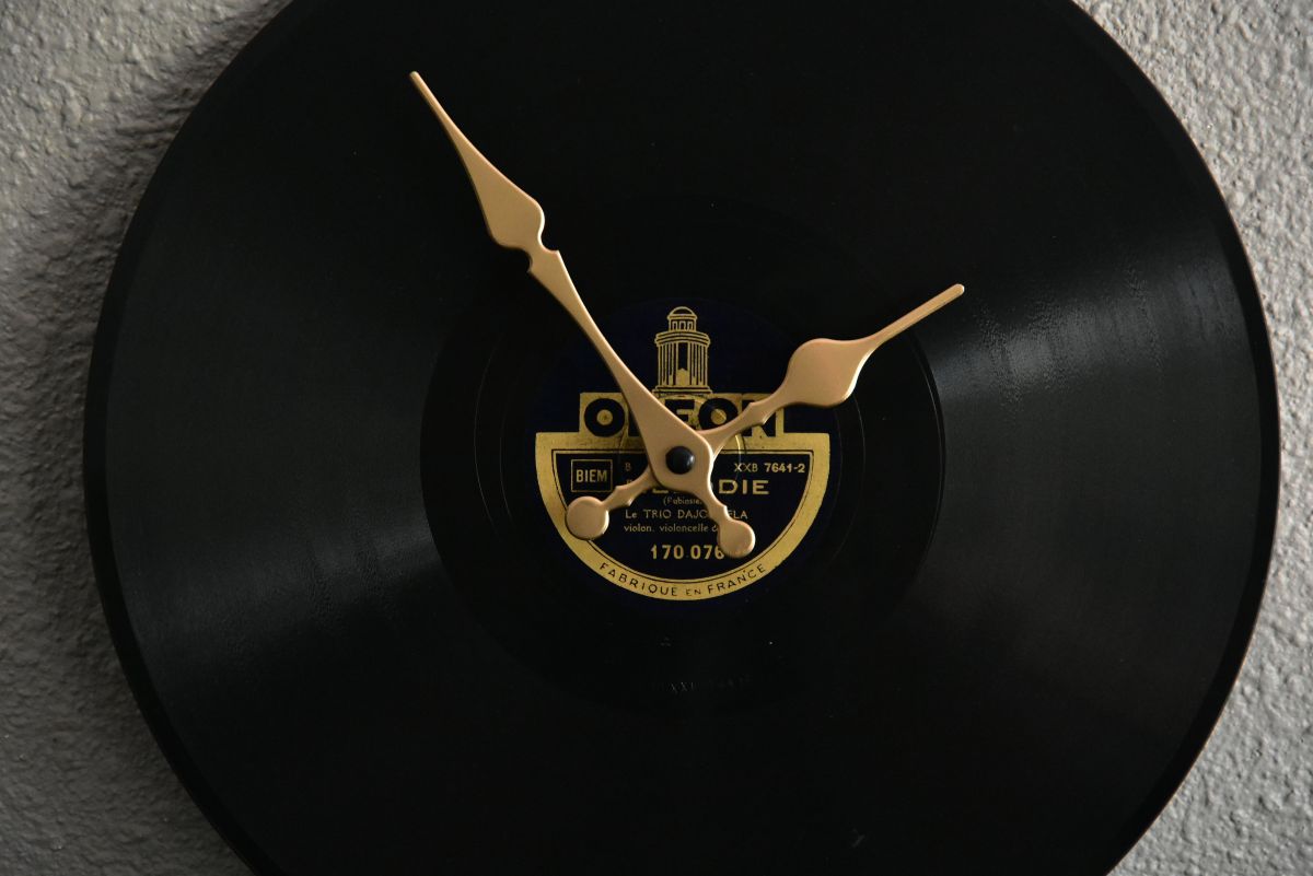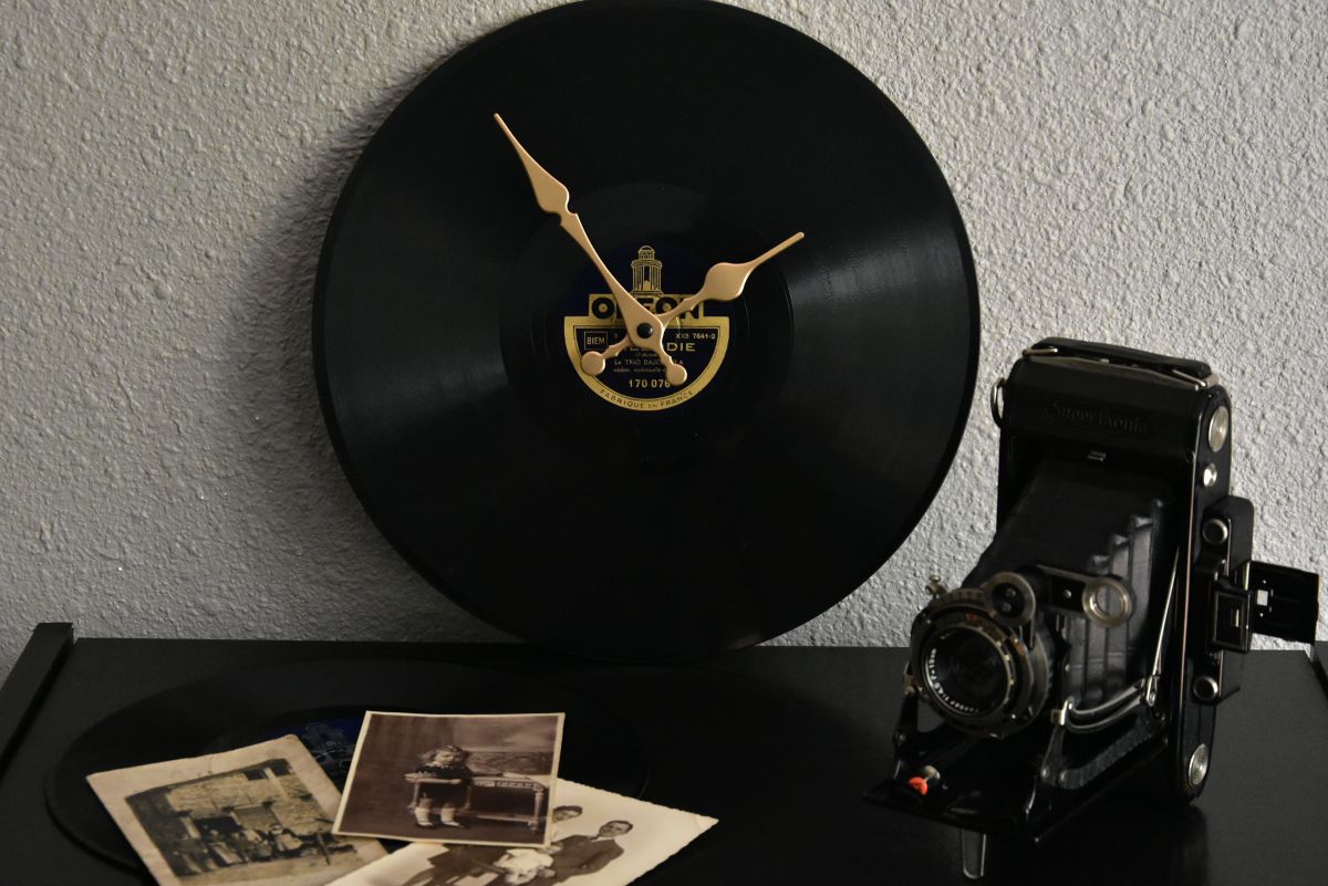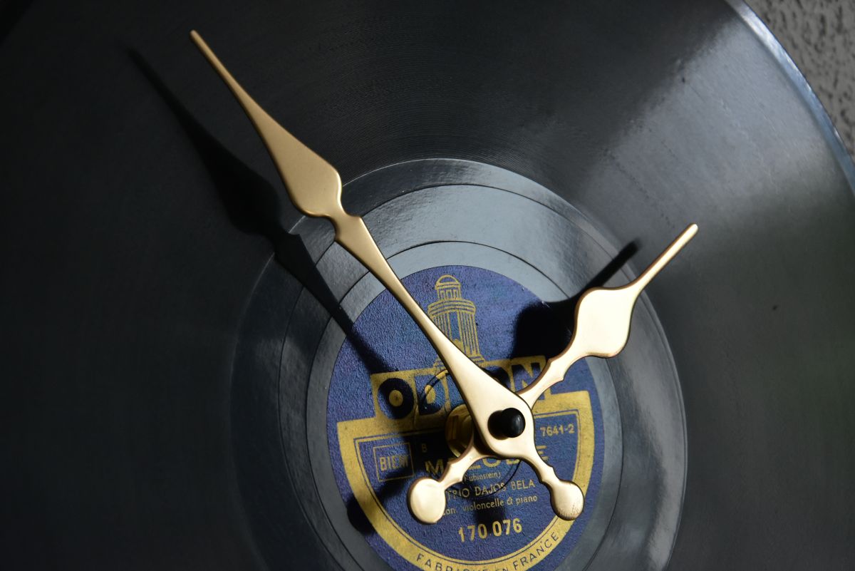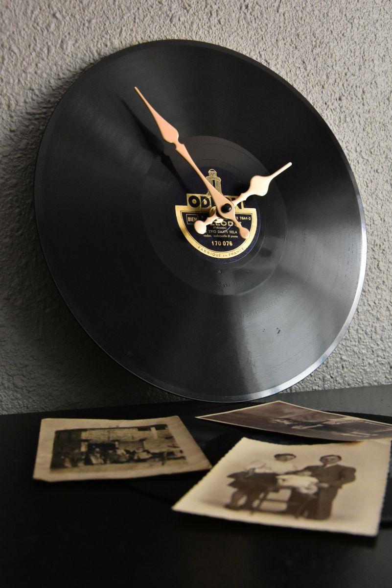 Jolie horloge originale réalisée à partir d'un authentique vieux disque 78 tours de la marque Odéon chiné dans un vide grenier, le charme rétro de ces vieux disques usés par des décennies d'utilisation , celui-ci porte encore l'étiquette au dos "Hôtel et Café VISTE Saint-Chinian" tout une époque !