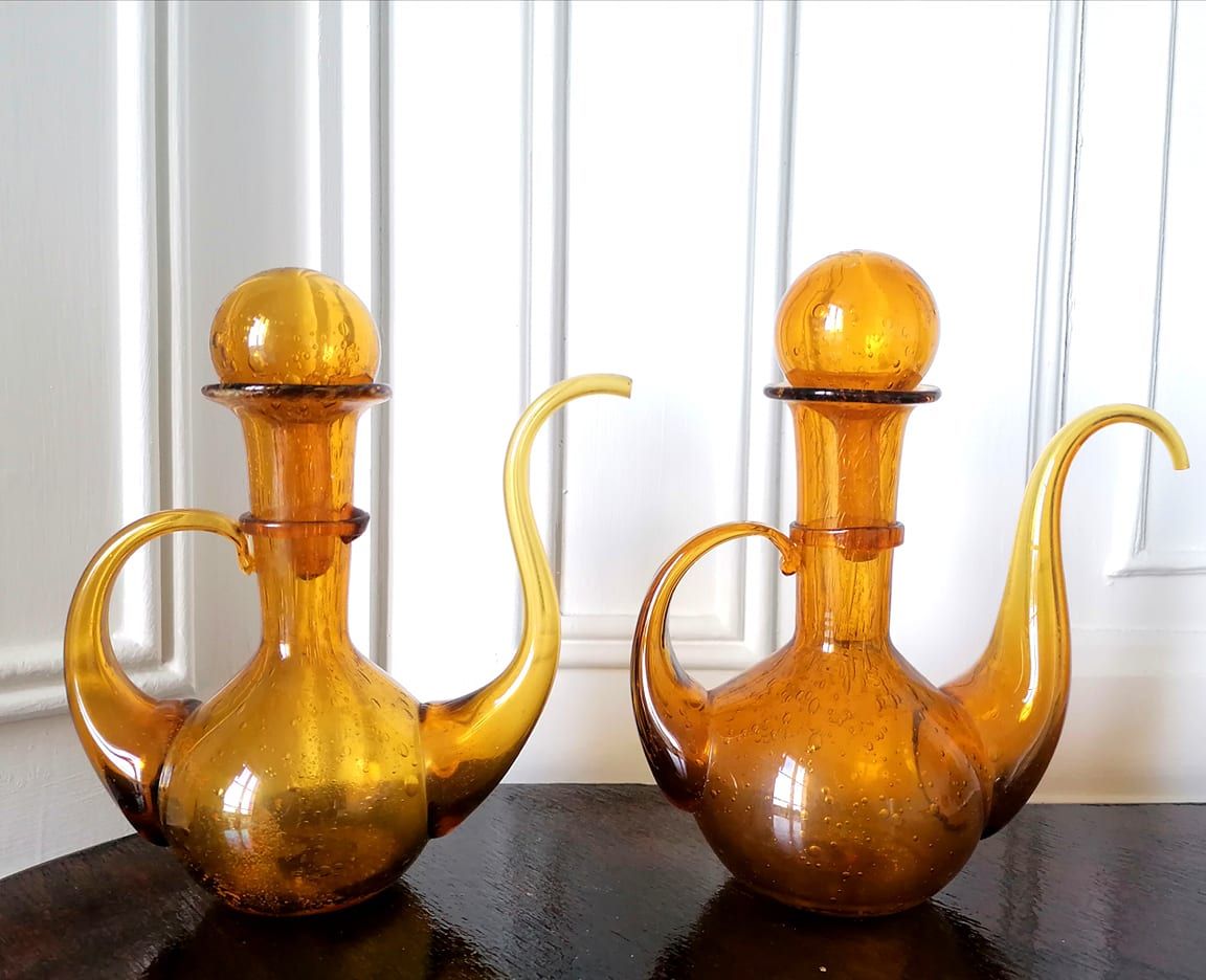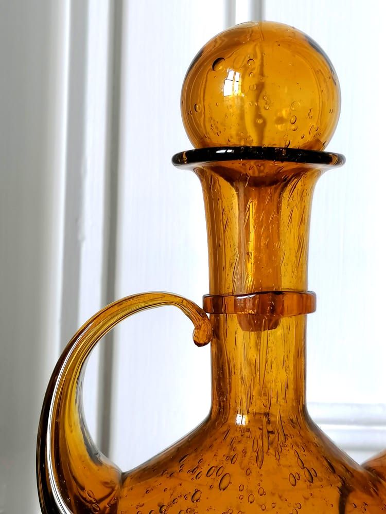 Paire de rares carafes en verre soufflé bullé Biot (non signées).,avec leurs bouchons d'origine.
