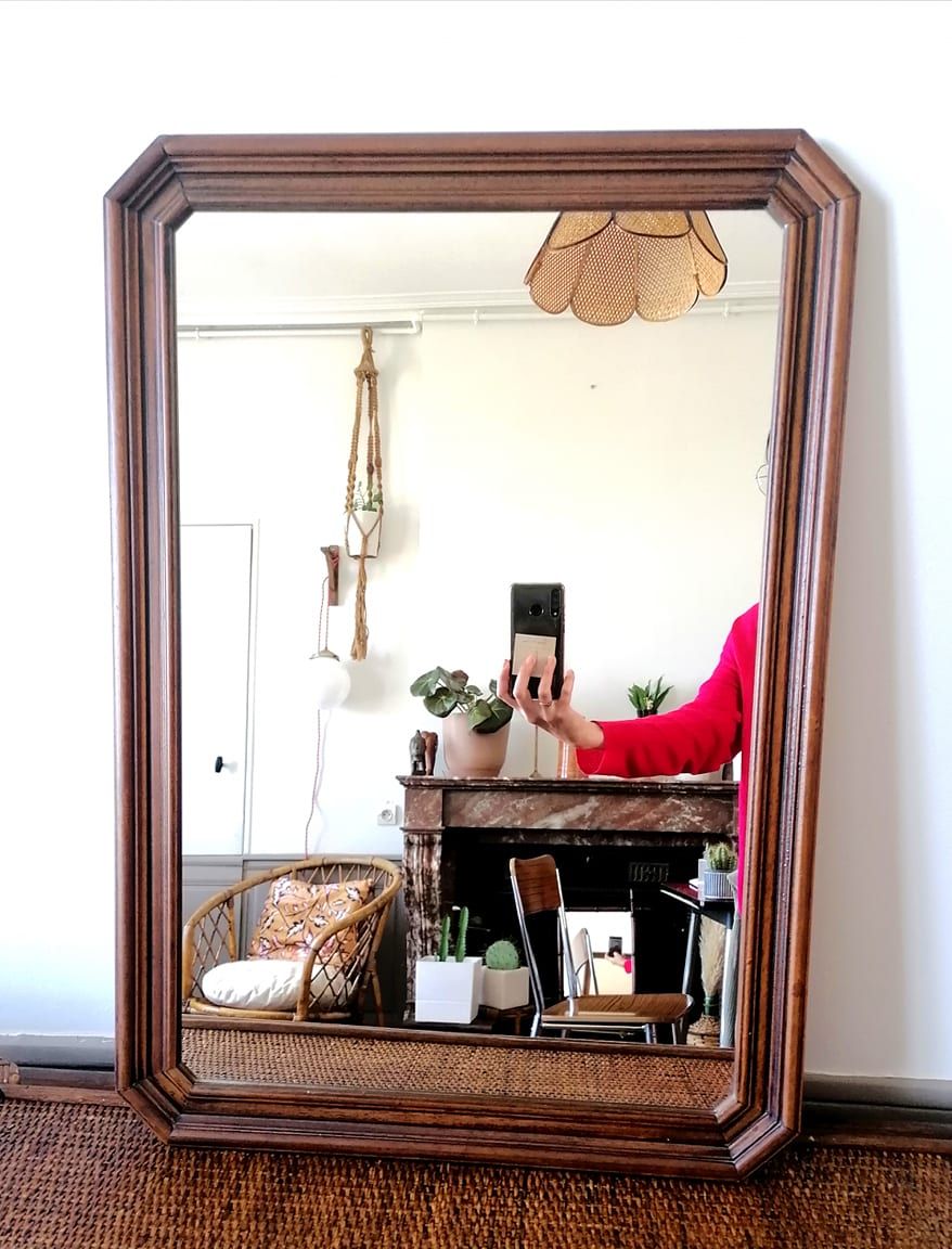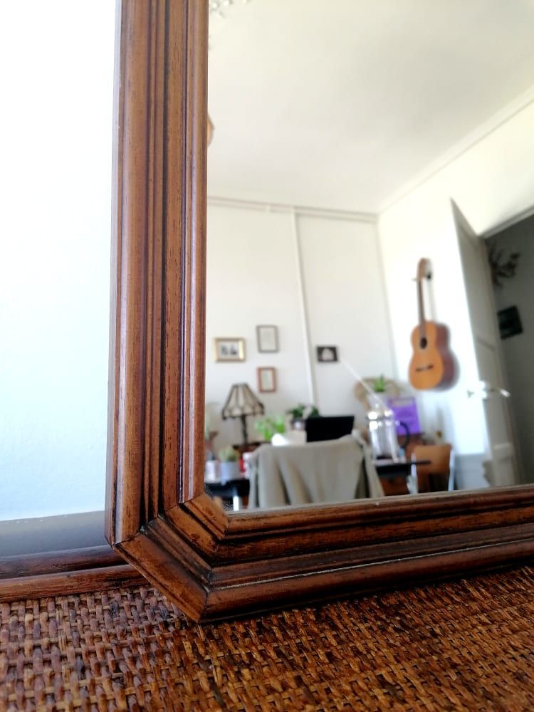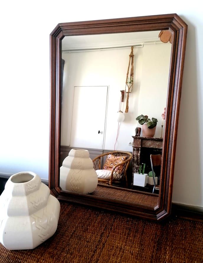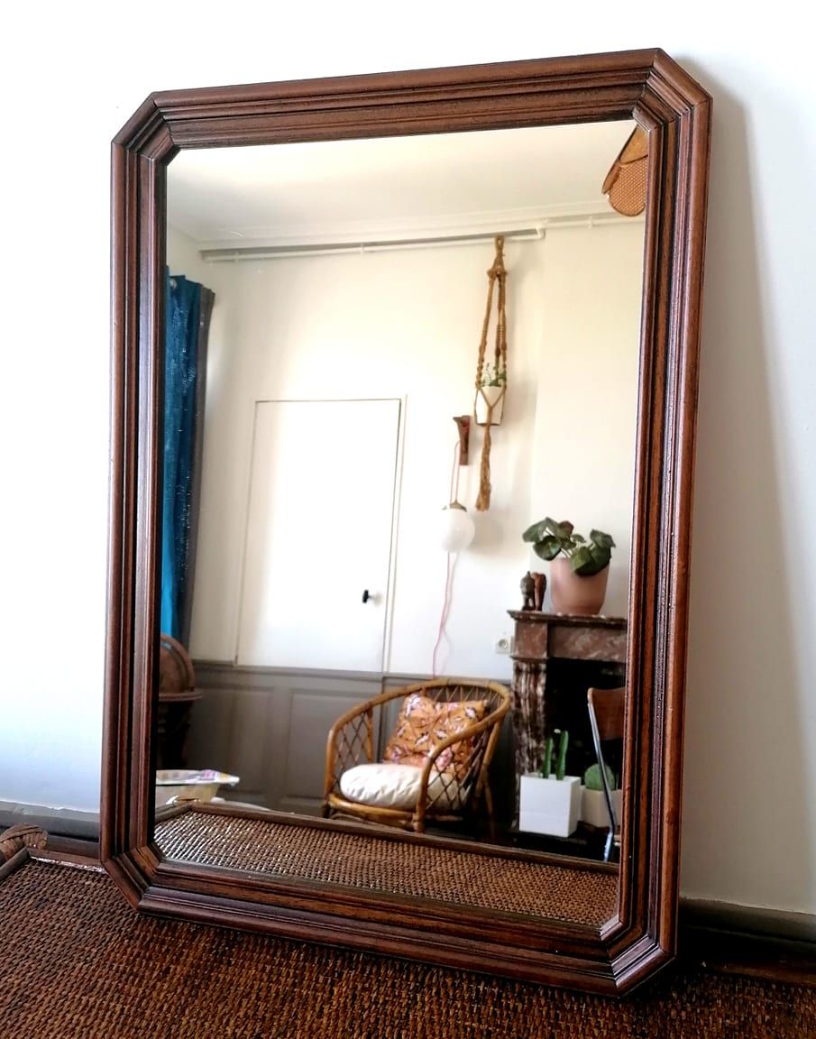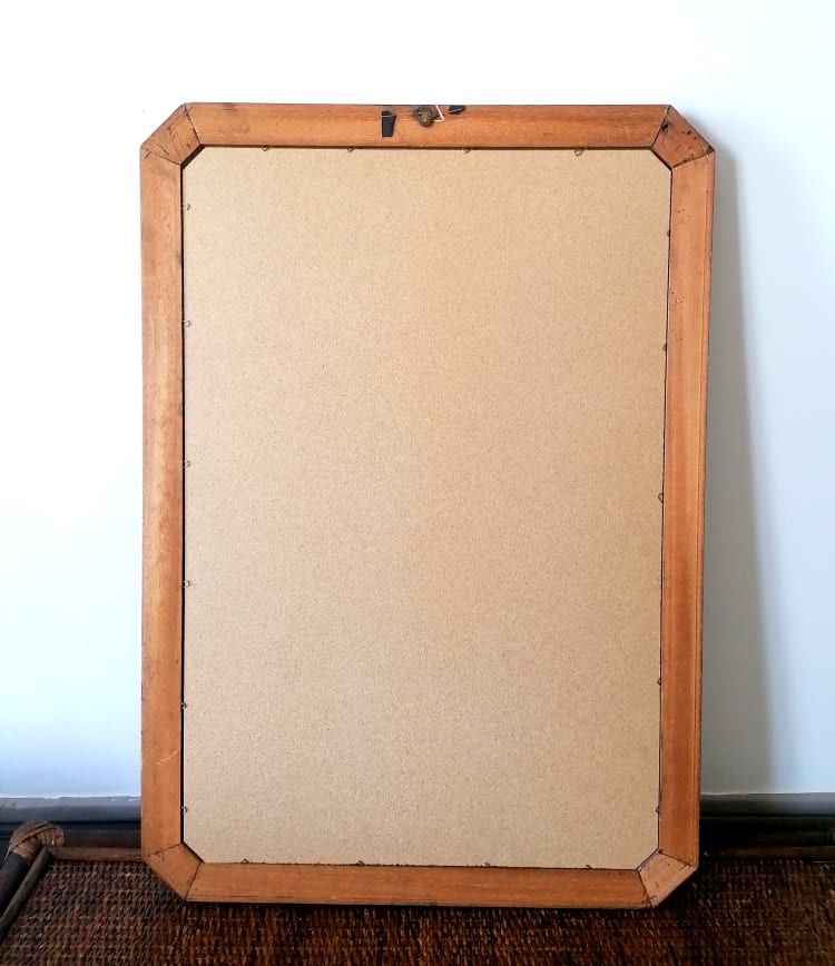 Miroir rectangulaire à pans coupés cadre en bois style ancien. Travail moderne, planche à l'arrière. Anneau d'accrochage.