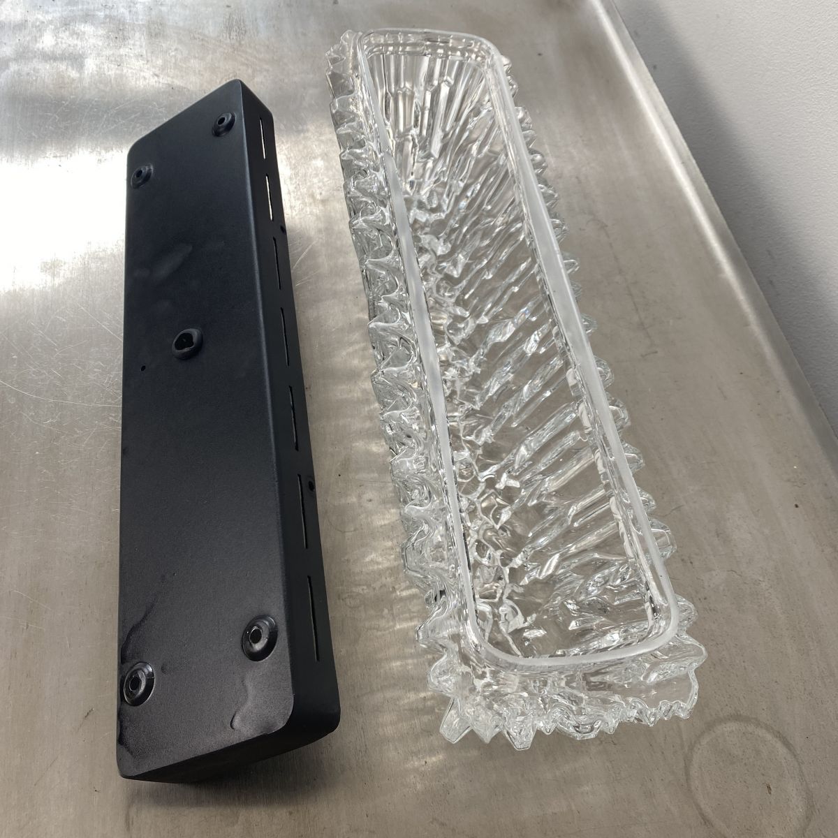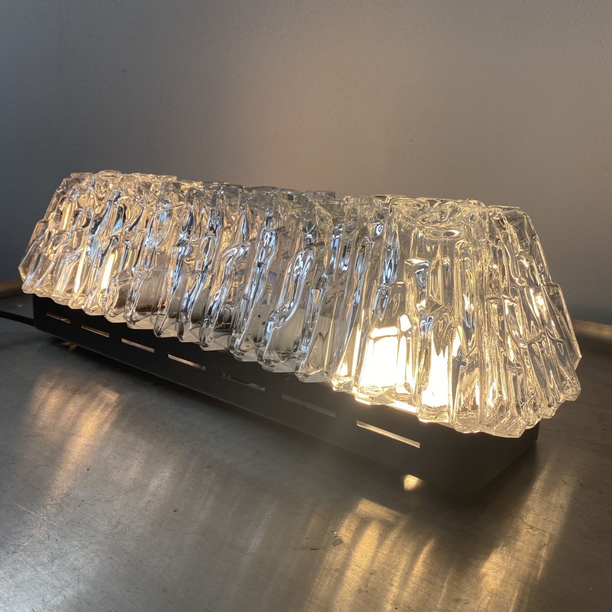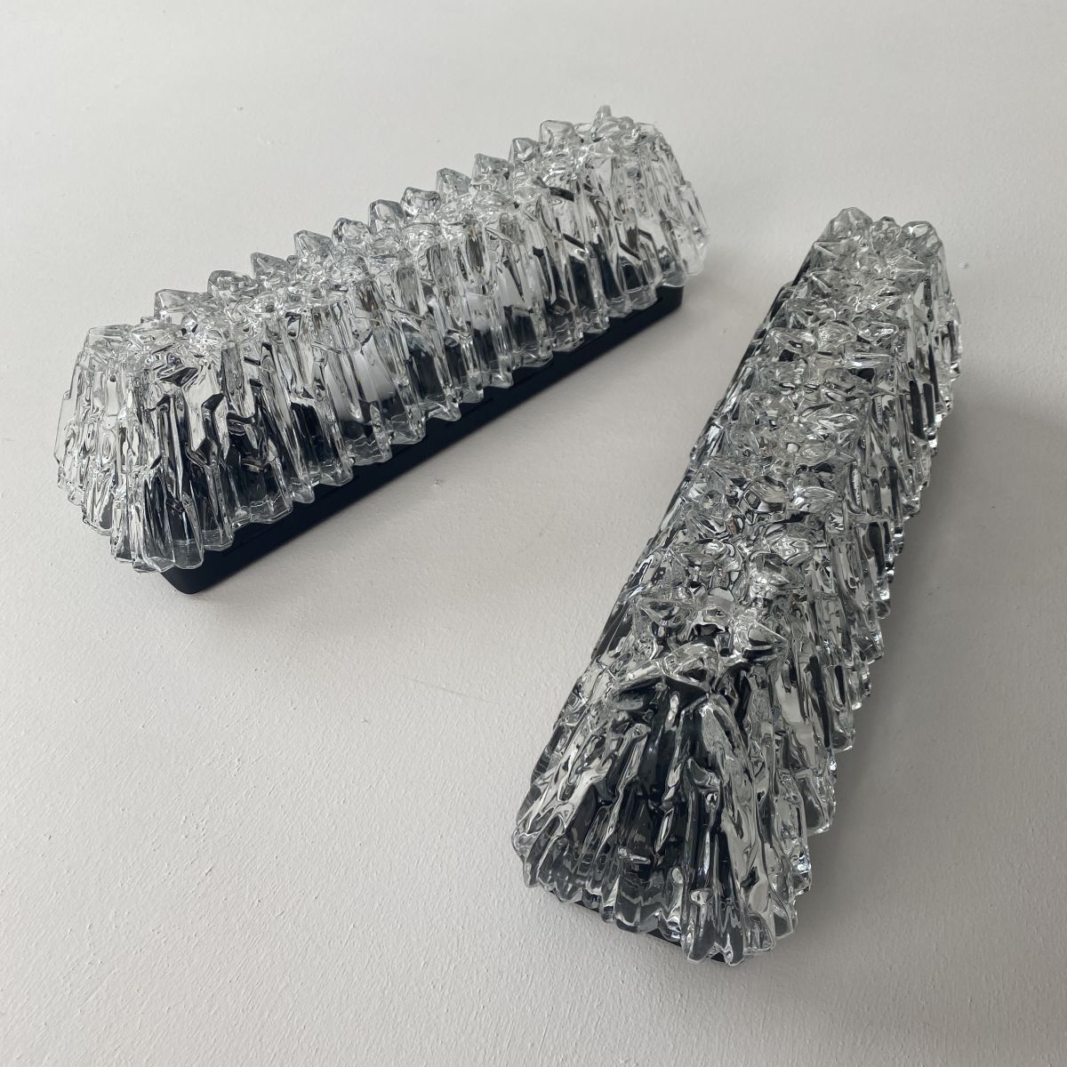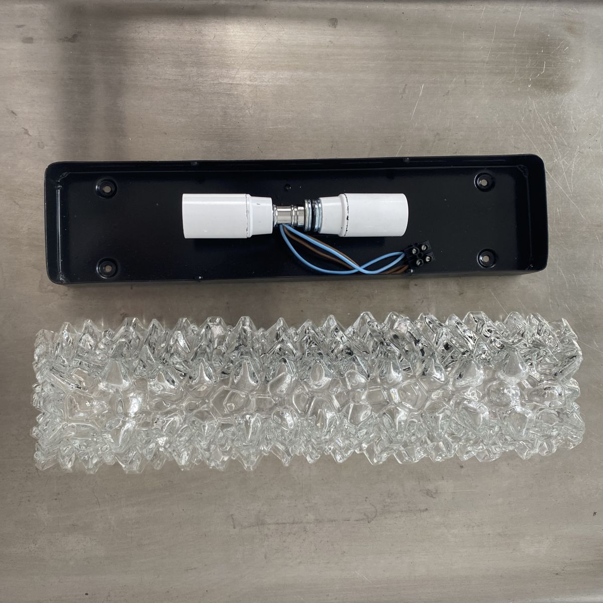 Rare. 2 grandes appliques en verre moulé des années 1950 de 34 cm de longueur. Peut être fixée à l’horizontale comme à la verticale. Du plus bel effet.