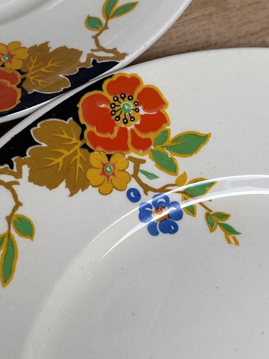 Set de 6 assiettes à dessert en faïence, superbe décor, début 20ième. Un petit côté Tea time à Downton Abbey! Bel état. Je possède également des tasses et leurs sous-tasses avec le même décor, n'hésitez pas à me contacter pour un envoi groupé! Diamètre 20,4 cm, hauteur 2 cm. V830