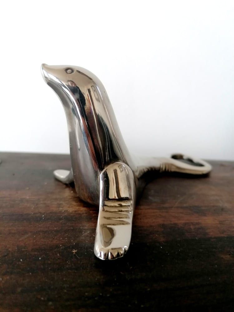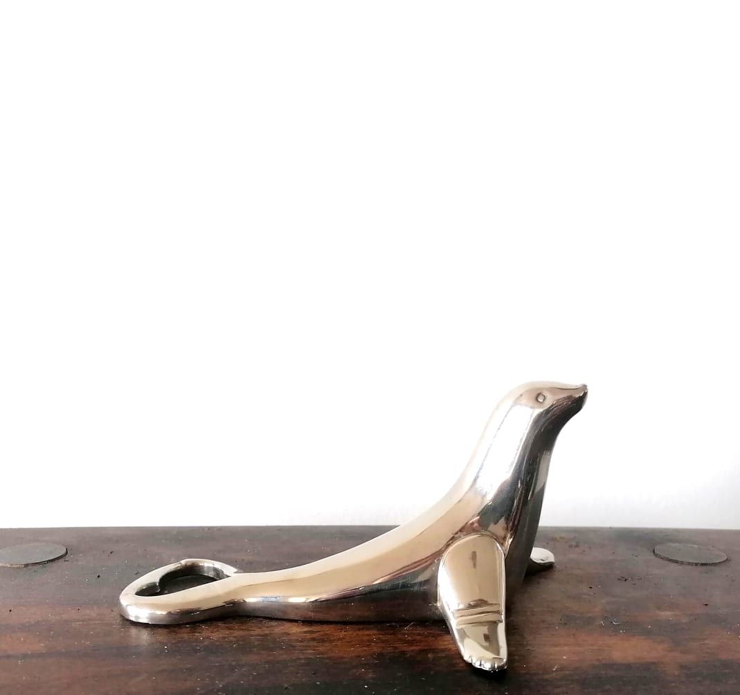 Décapsuleur en métal argenté, en excellent état. Un objet kitsch pour décapsuler vos breuvages avec originalité !