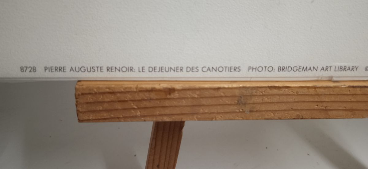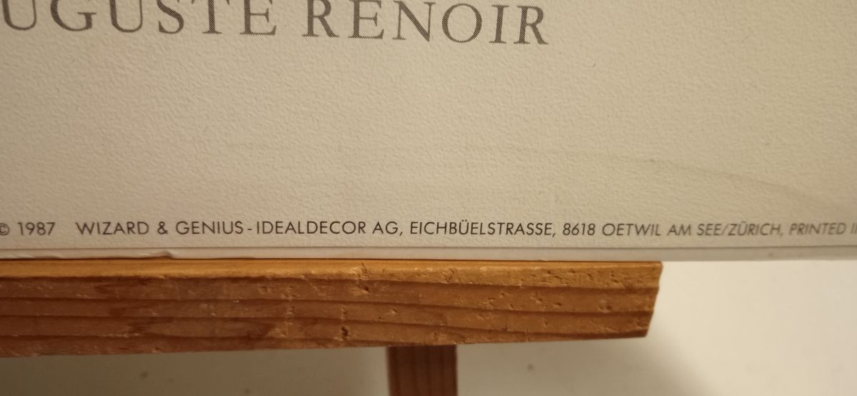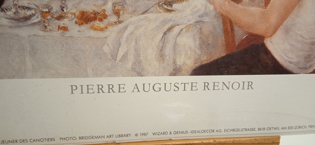 Imprimé le long du bord inférieur du support est la légende - 8728 PIERRE AUGUSTE RENOIR: LE DEJEUNER DES CANOTIERS PHOTO: BRIDGEMAN ART LIBRARY (circa sign) 1987 WIZARD & GENIUS-IDEALDECOR AG, EICHBUELSTASSE, 8618 OETWIL AM SEE/ZURICH. IMPRIMÉ EN SUISSE
