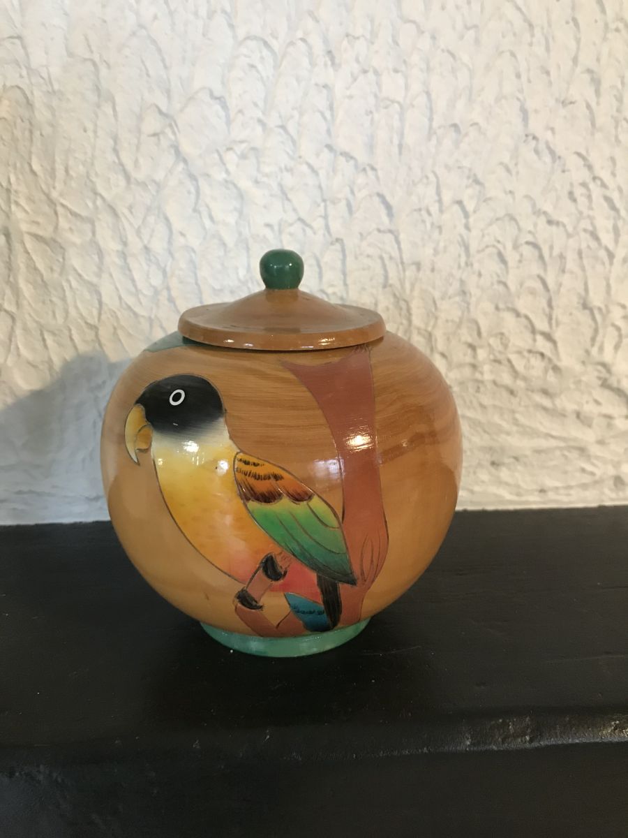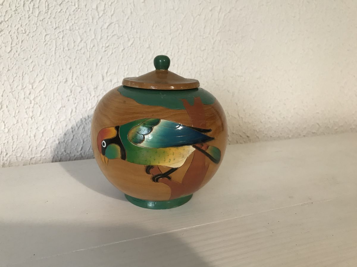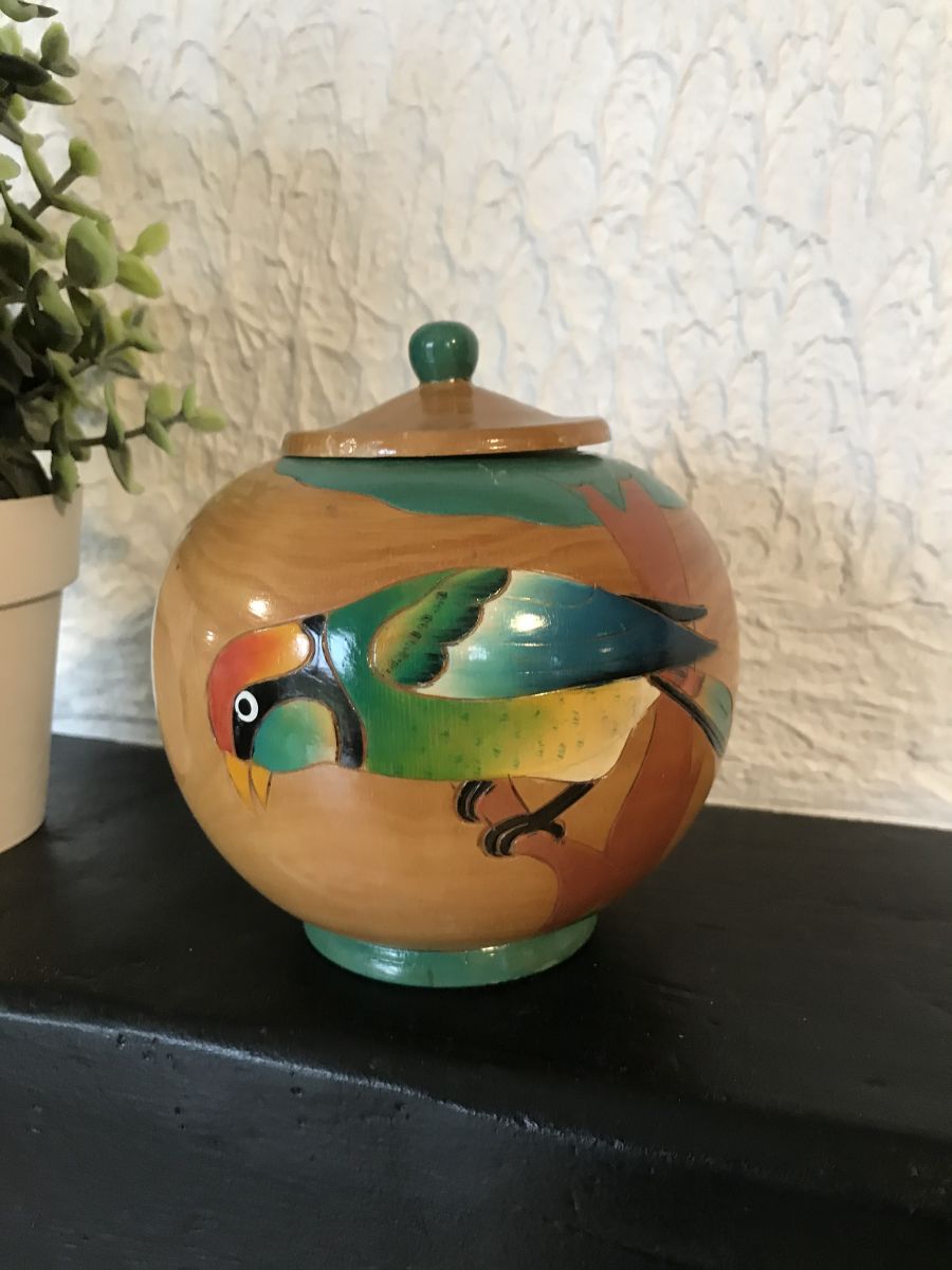 Très jolie boite en bambou avec 2 motifs d'oiseaux d'une hauteur de 13 cm et 12 cm de diamètre