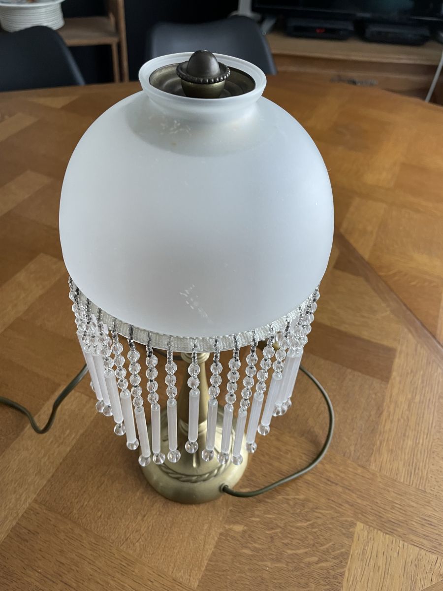 Superbe lampe à poser avec pampilles en TBE avec verre dépoli et pied en laiton.