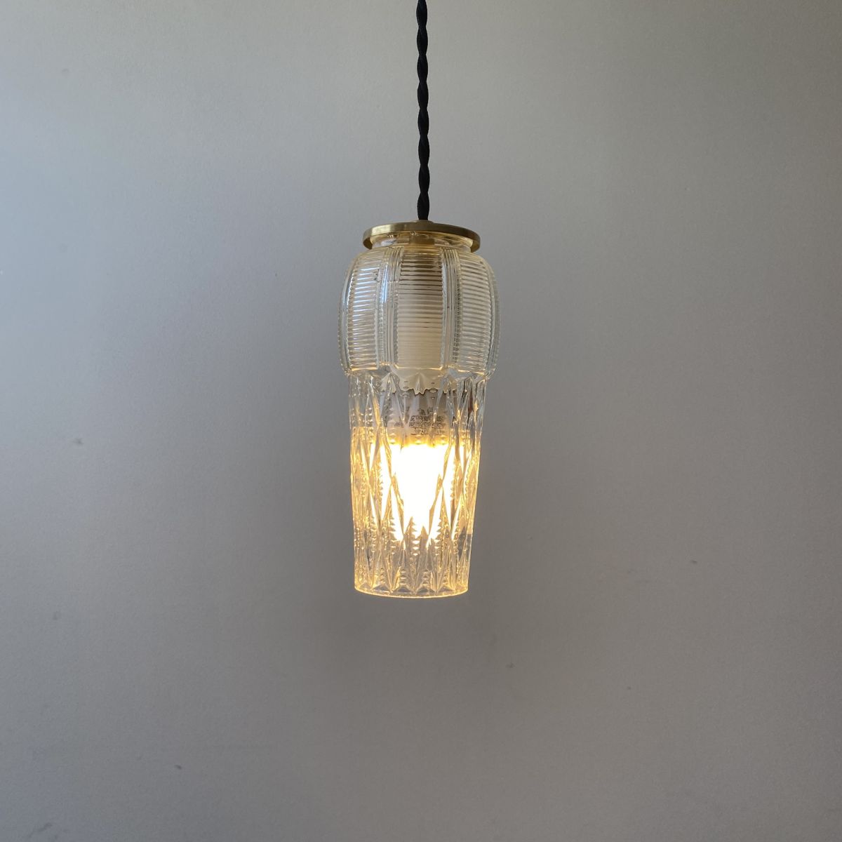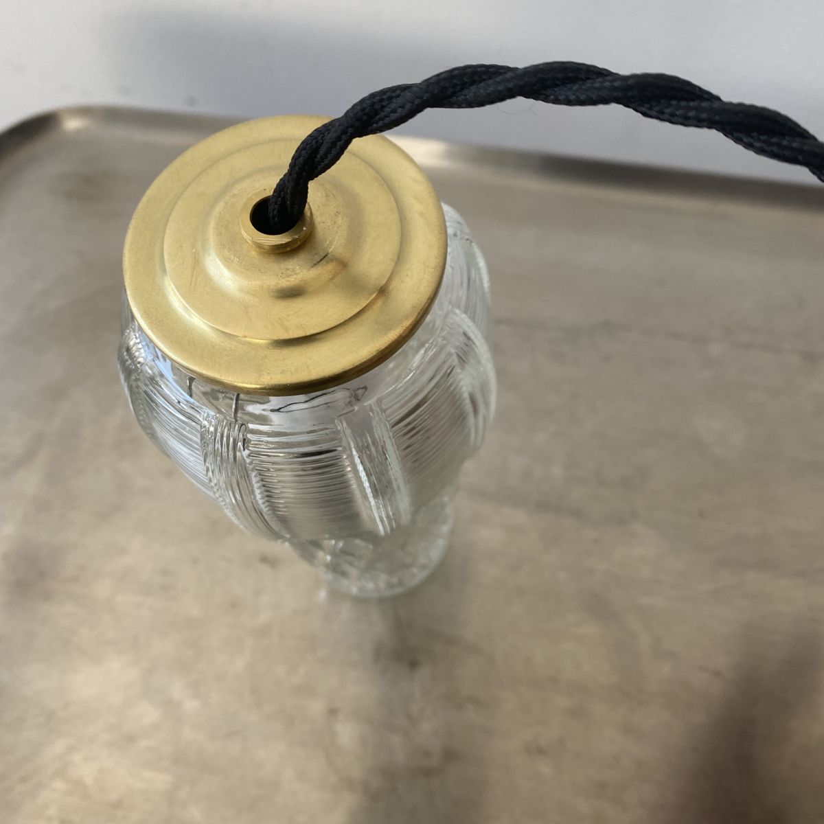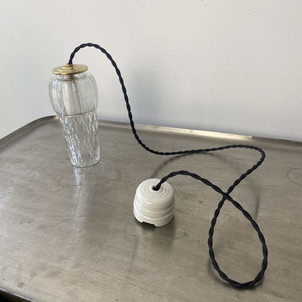 L’électricité a été refaite. Douille à vis petit culot (Ampoules E14). Branchement par domino. Fil noir en tissu tressé et rosace de fixation en porcelaine.