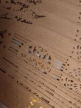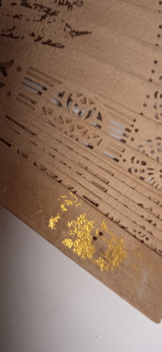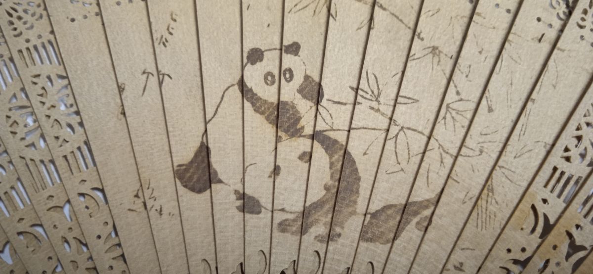It has a very delicate cut out pattern and depicts pictures of a pair of pandas on one side and a view of a distant mountain with trees in the foreground.