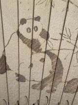 Il a un motif découpé très délicat et représente des images d'une paire de pandas d'un côté et une vue d'une montagne lointaine avec des arbres au premier plan.