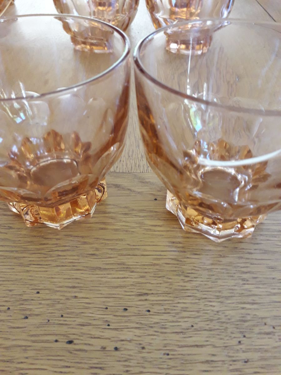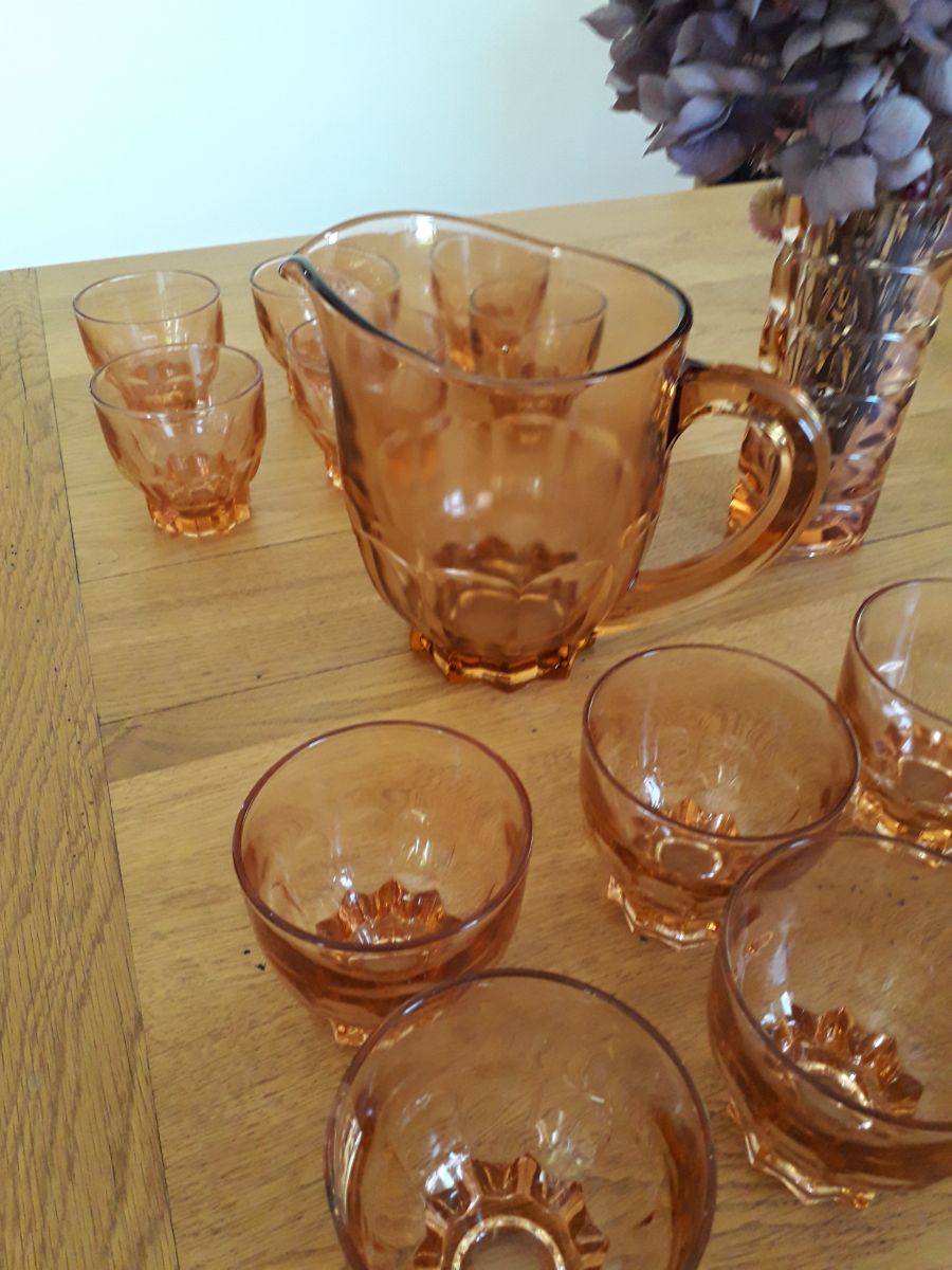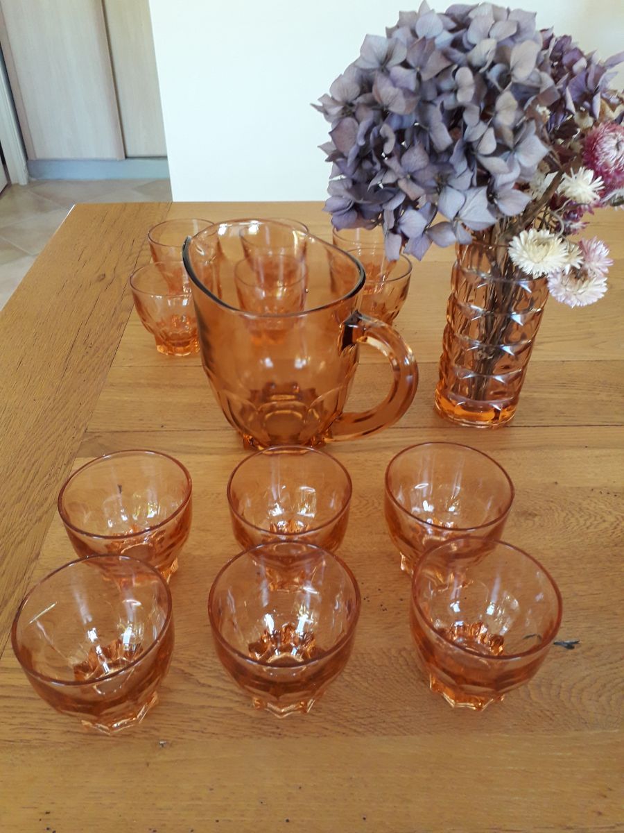 Joli service composé d'une carafe rose et 12 verres. Le tout en très bonne état, sauf deux verres (voir dernière photo). De fabrication française, délicatement vintage.