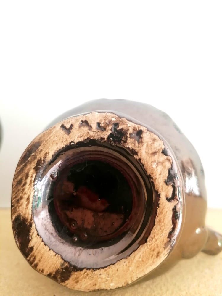 Décor en céramique irisée à coulures jaune et blanche sur fond marron glacé.
