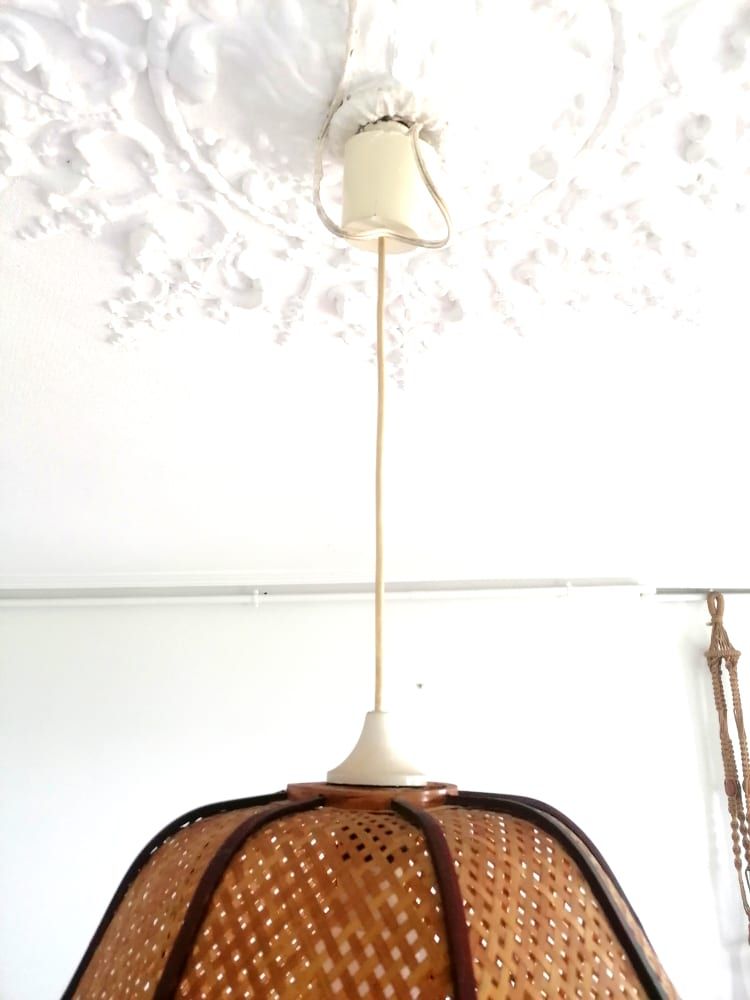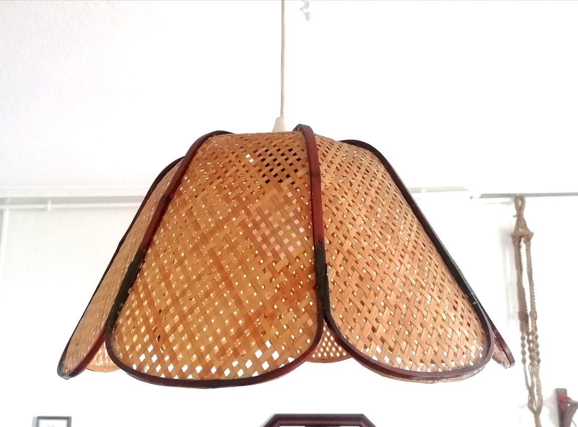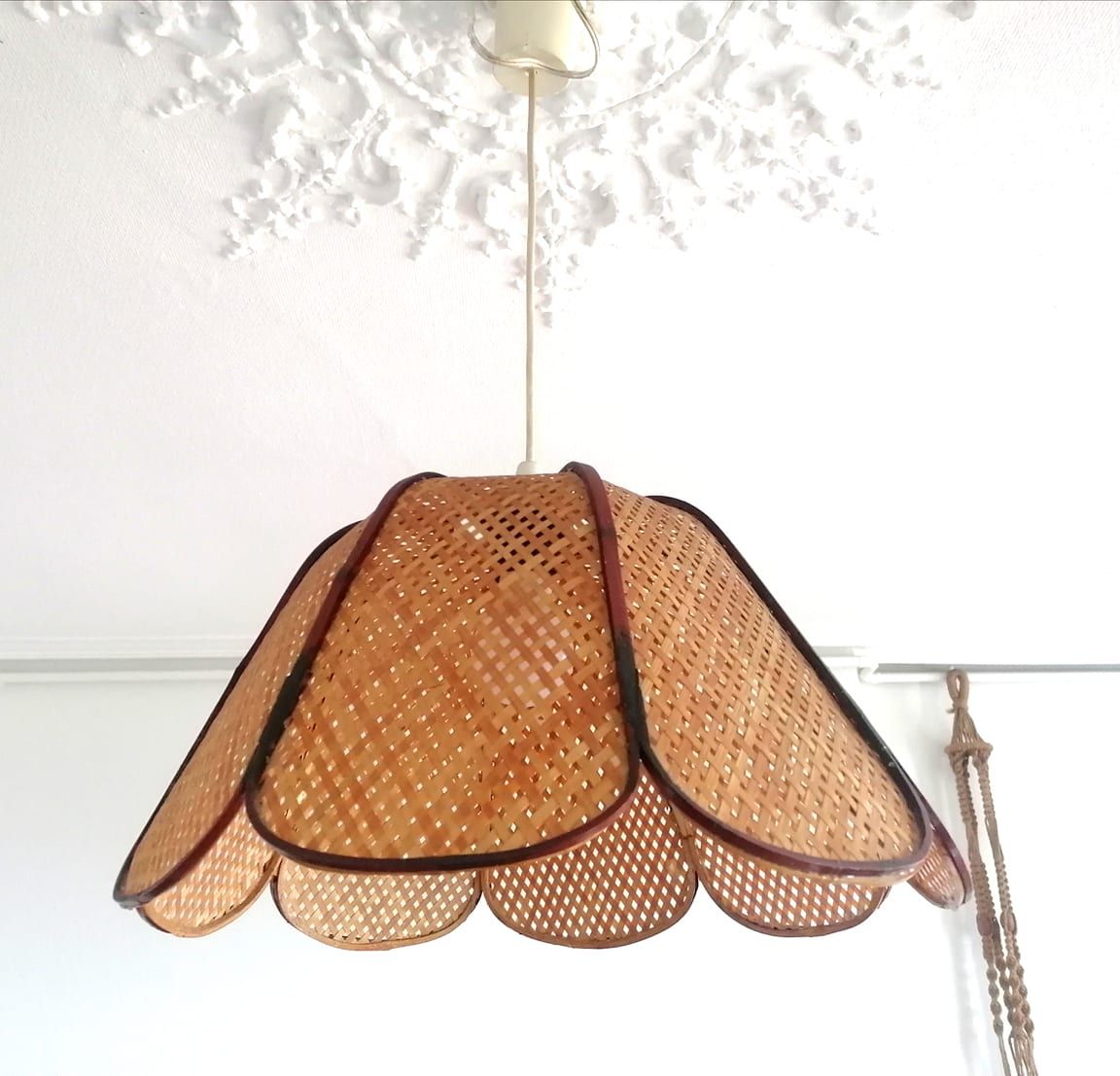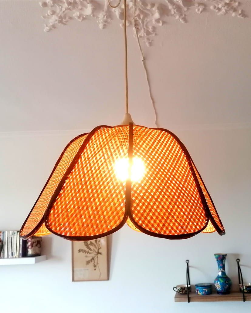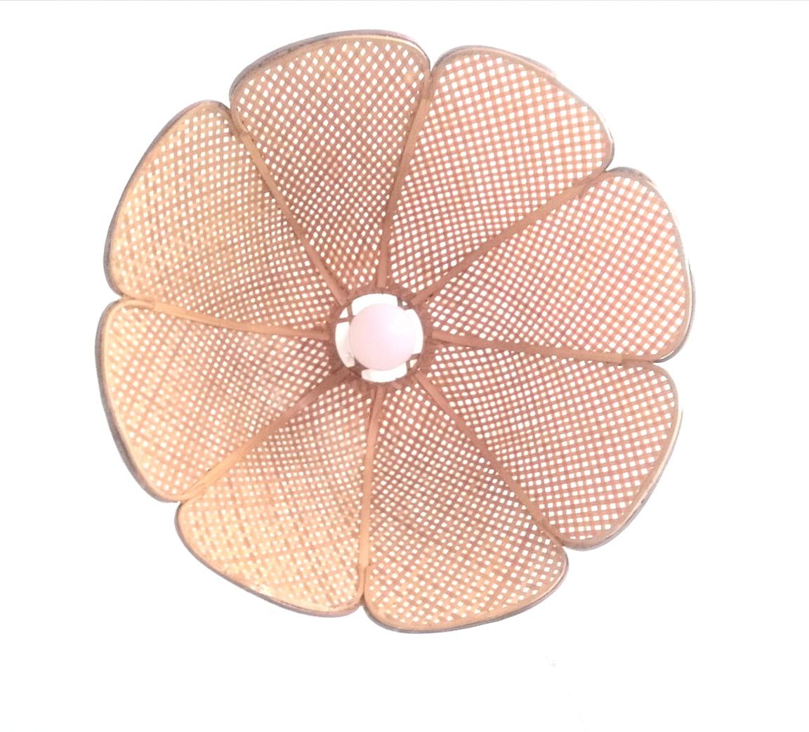 Suspension style cannage confectionnée par un treillis de fines lamelles de bois. Forme de fleurs à 8 pétales.