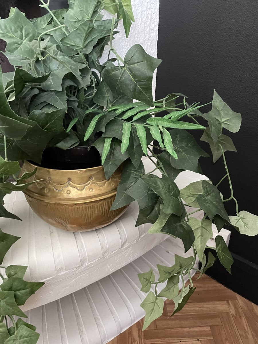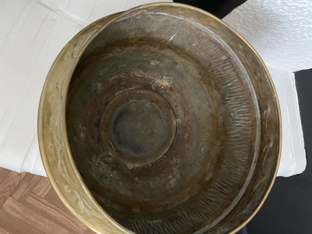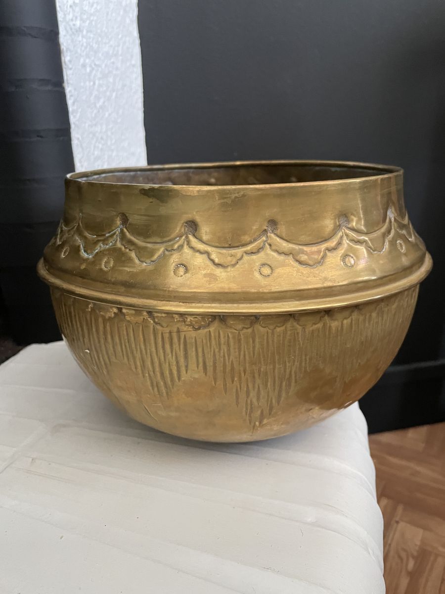 Joli cache-pot pour plantes en cuivre ou laiton d'une hauteur de 16 cm par 19,5 cm de diamètre en haut et 11 cm à la base.