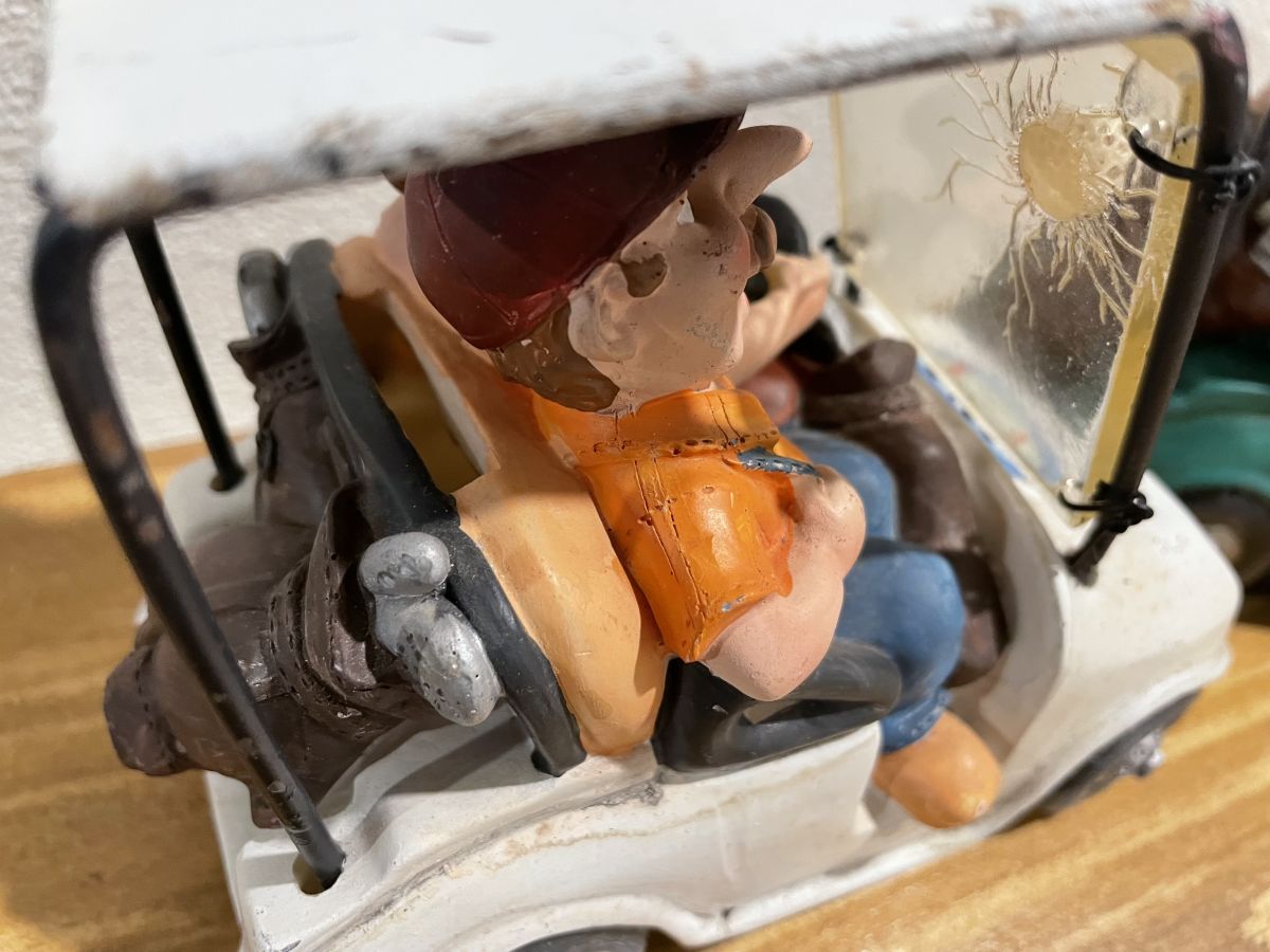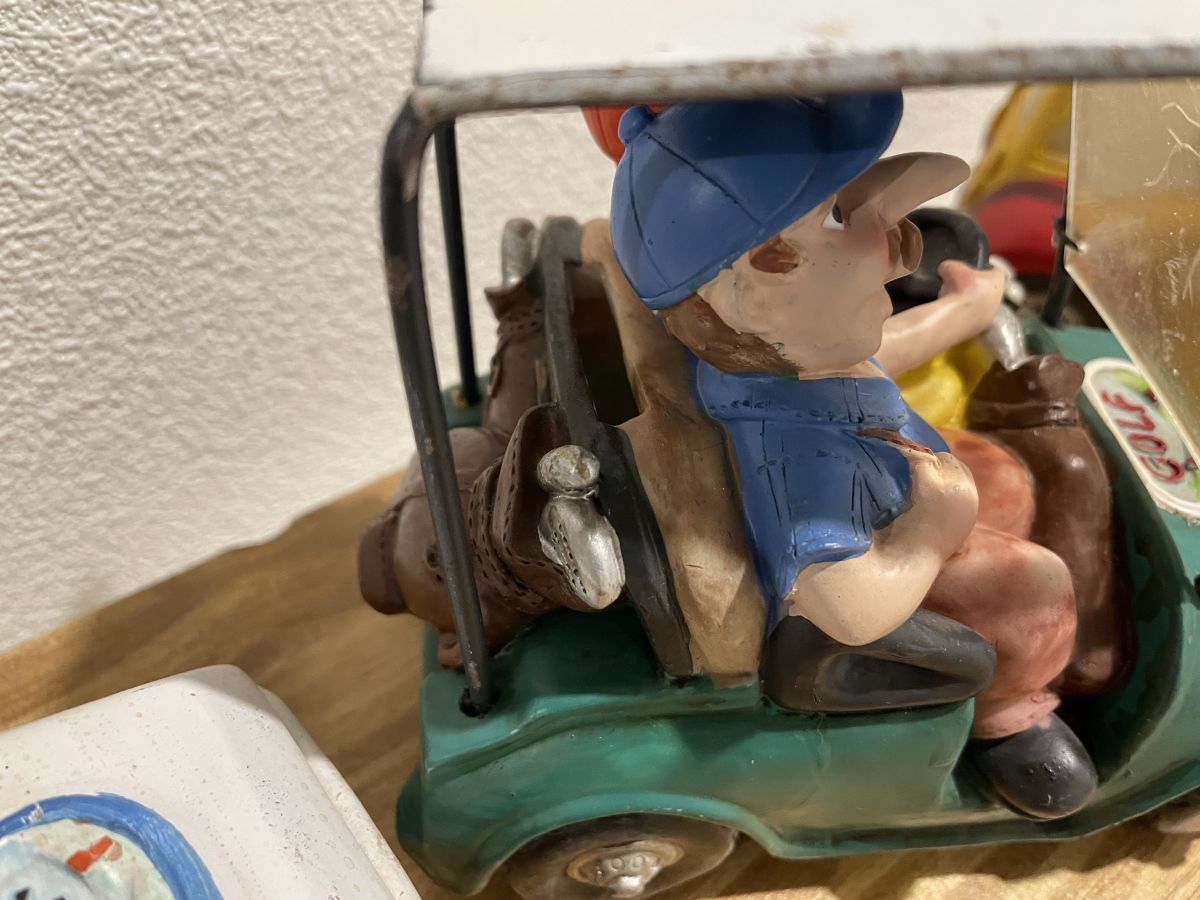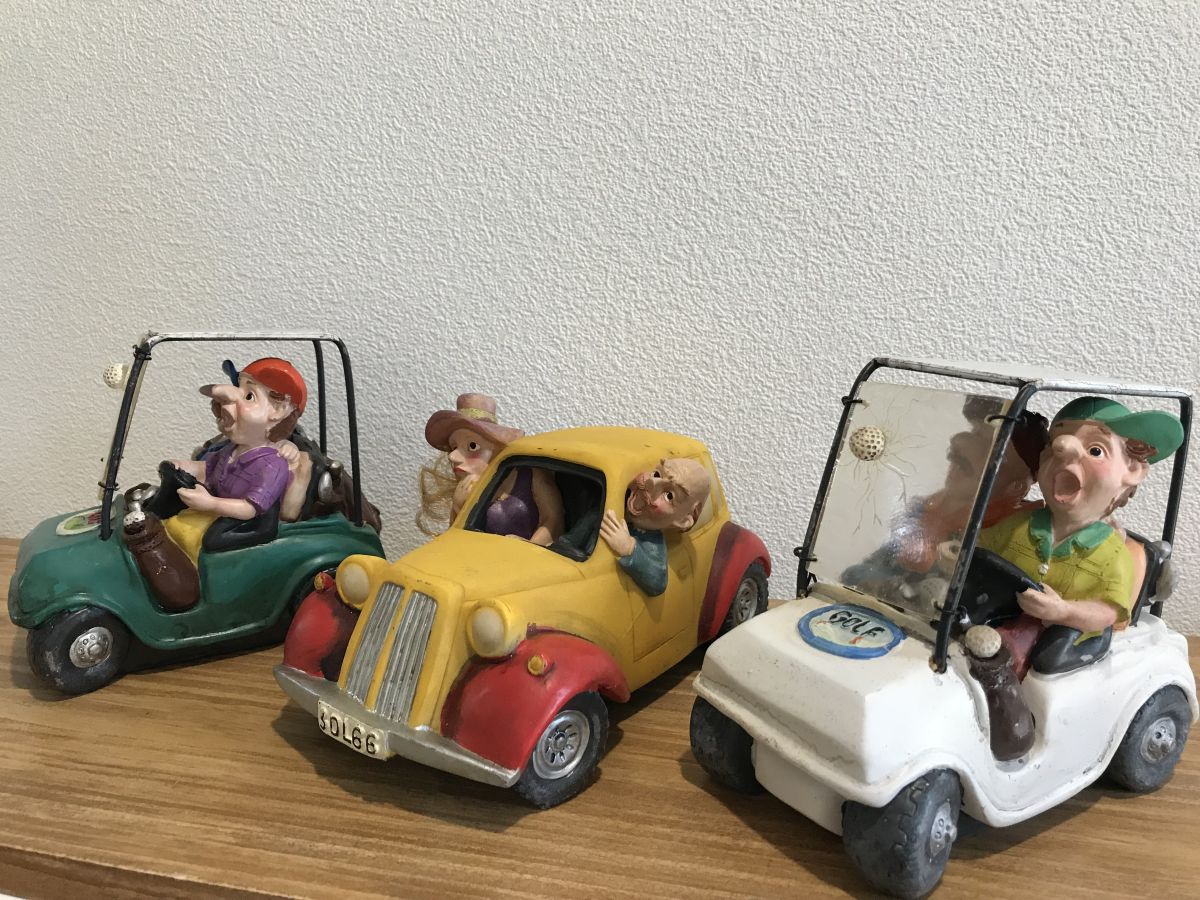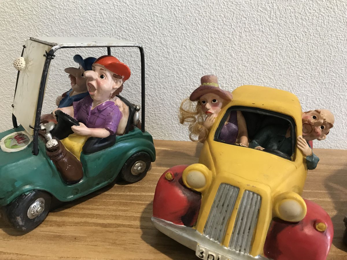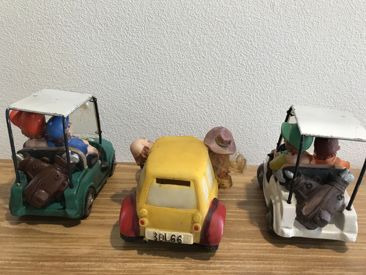 Lot de 3 anciennes tirelires humouristiques à utiliser comme déco ou alors possibilité de les réutiliser en tirelire en bouchant le trou qui servait à récupérer les pièces sous chaque véhicule.