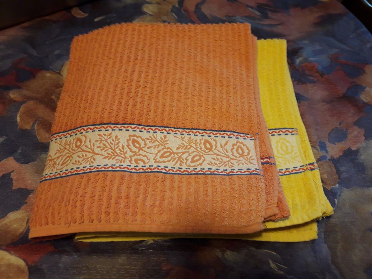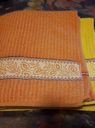 L'une de couleur saumon, l'autre de couleur jaune d'oeuf, toutes deux avec bandeau floral assorti.