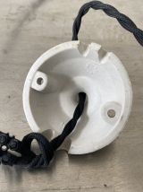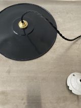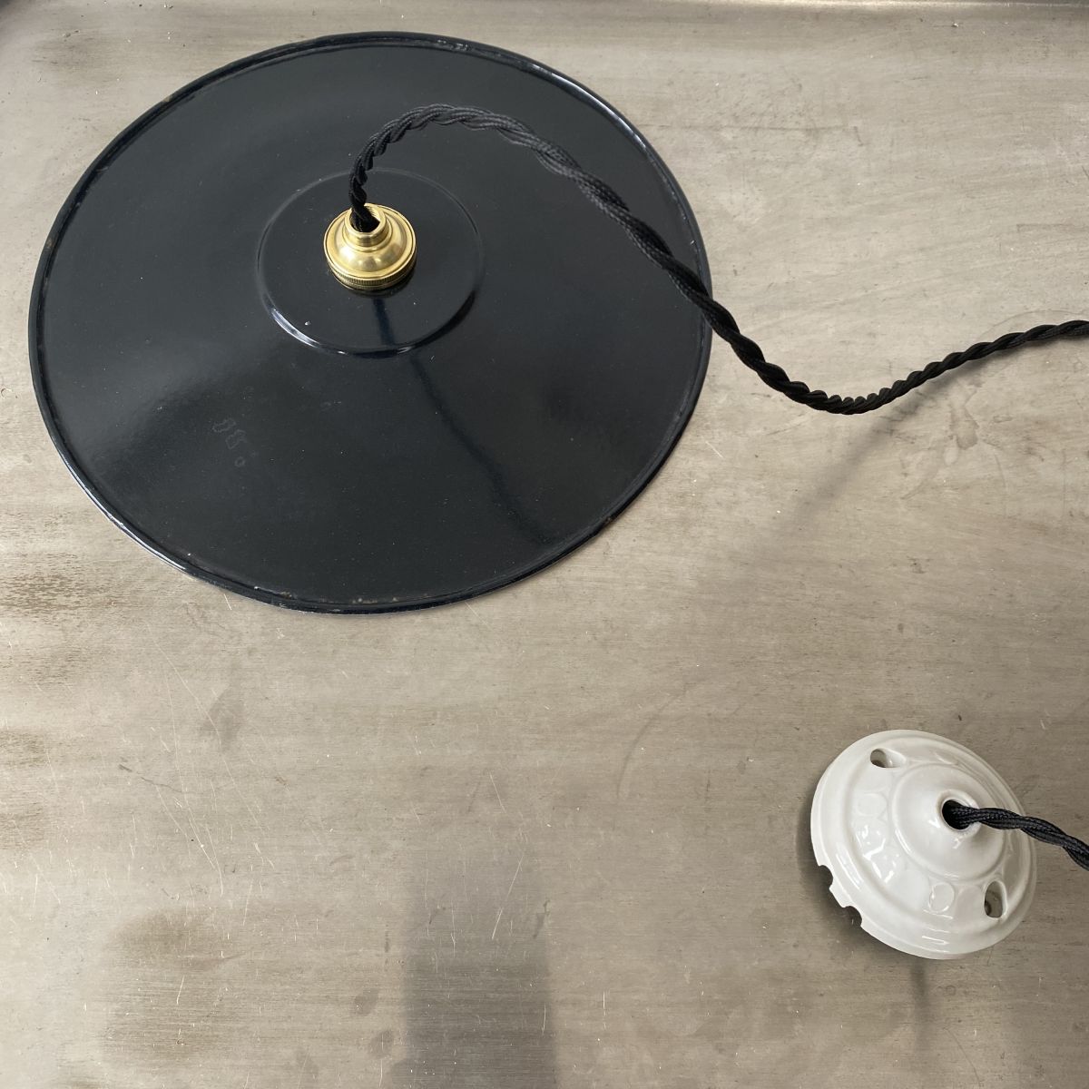 L’électricité a été refaite avec douille à baïonnette en laiton (Ampoules B22). Branchement par domino. Fil noir en tissu tressé et rosace de fixation en porcelaine.