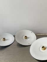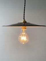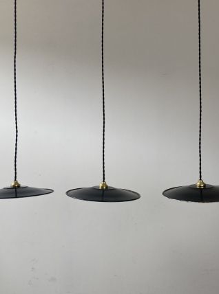3 suspensions industrielles plates en tôle émaillée. Années 1960. En très bel état malgré des traces de rouilles et sauts d’émail. Idéales avec ampoules Edison à filaments.