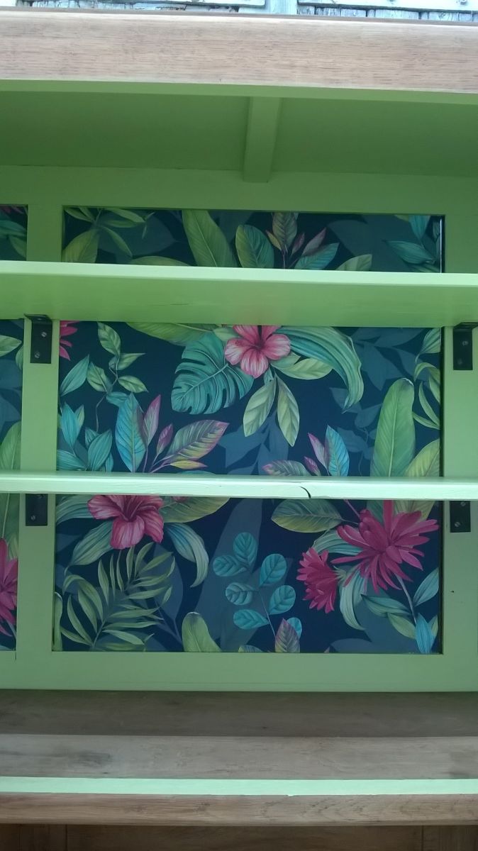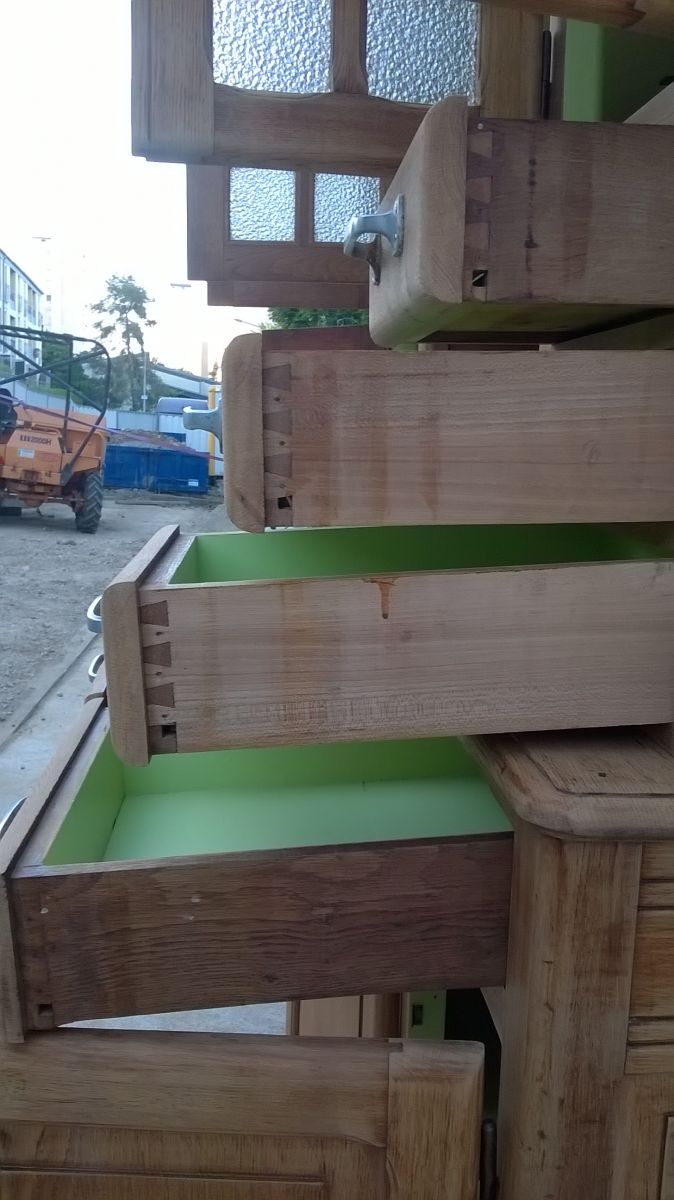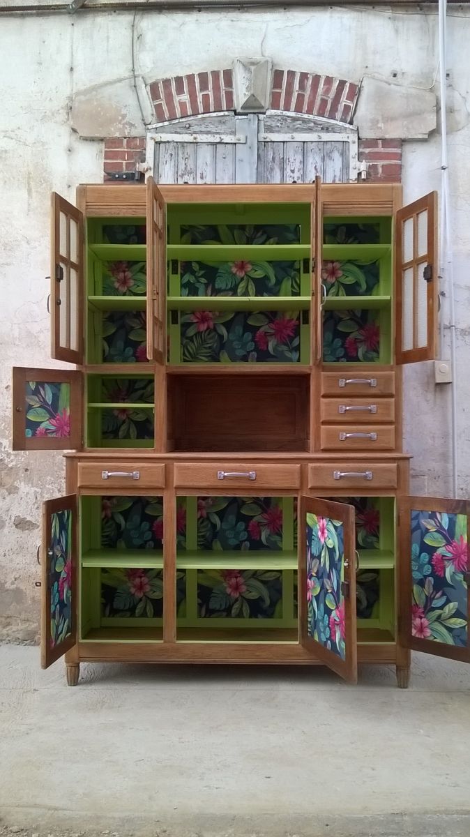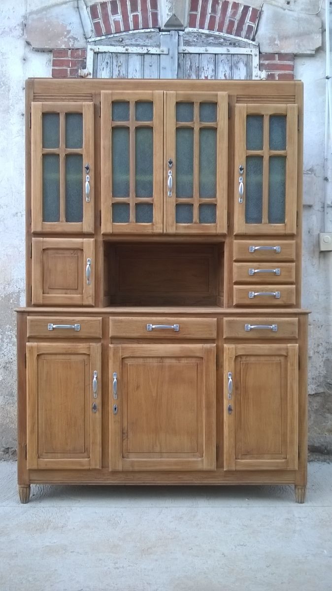 Superbe grand buffet vaisselier parisien année 30. Il est en chêne massif de b elle qualité. Il a été poncé a la main pour le rendre plus moderne. Les intérieur on été aménagée d un papier a décor floral. Et peint de couleur vers pomme, les étagères et tiroir peint également en vert pomme. Les portes du haut sons vitré d origine. A noté un léger fêle sur un carreau mes reste solide. Il y a 5 clés d origine pour 6 serrures et fonctionnel. Le buffet est surmonté de 4 pieds art déco très solide. Le meuble est également très solide.