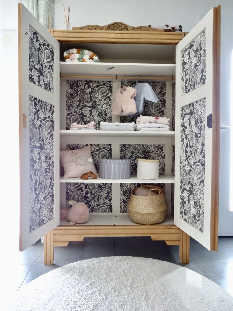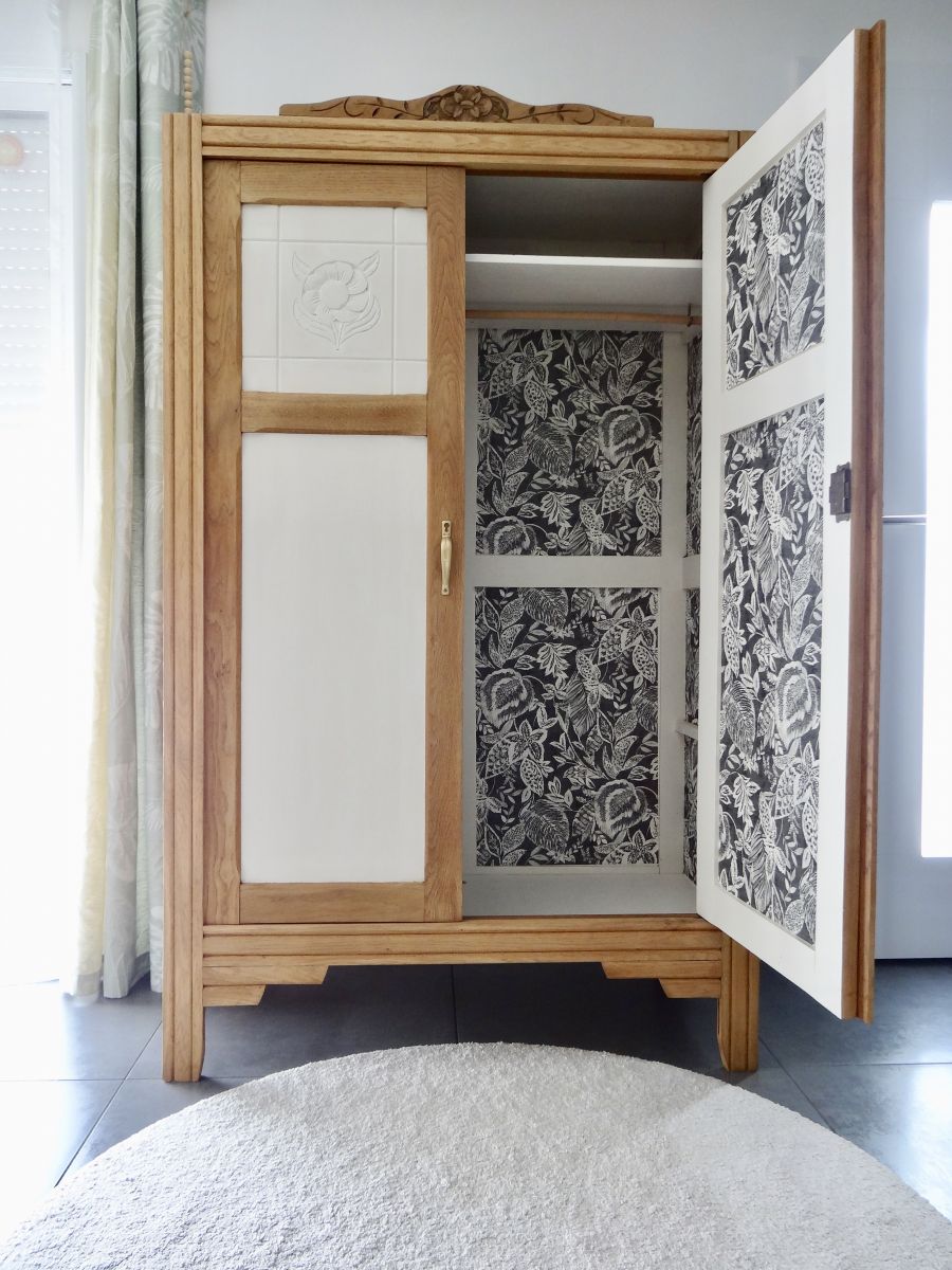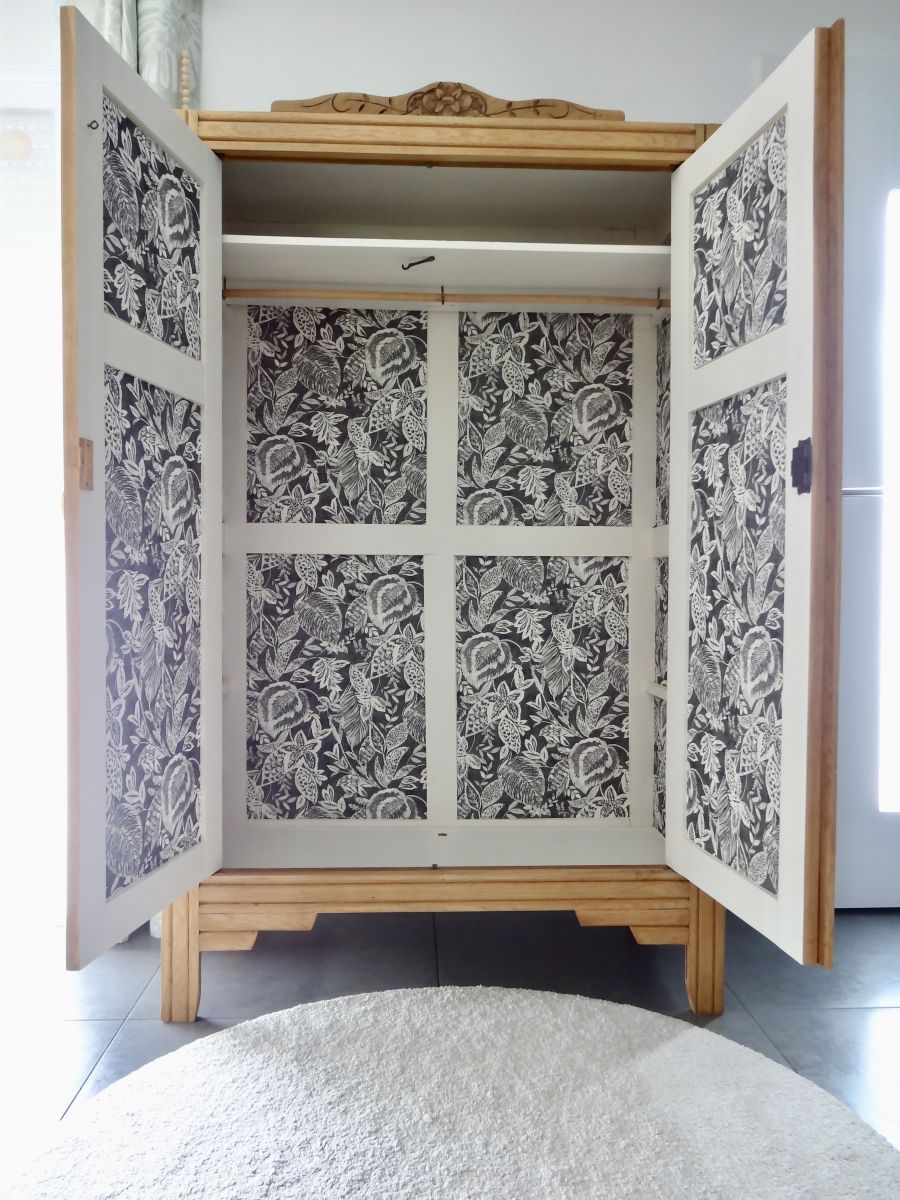Armoire parisienne style art déco en chêne et placage chêne. Elle a été entièrement restauré (ponçage, traitement du bois, vernis...). L'intérieur est recouvert d'un papier peint. Peinture "school house white" de farrow and ball. Les 2 étagères du milieu peuvent être retirées pour l'utiliser comme penderie.