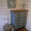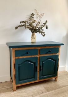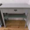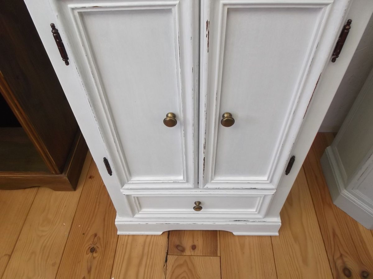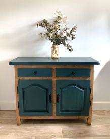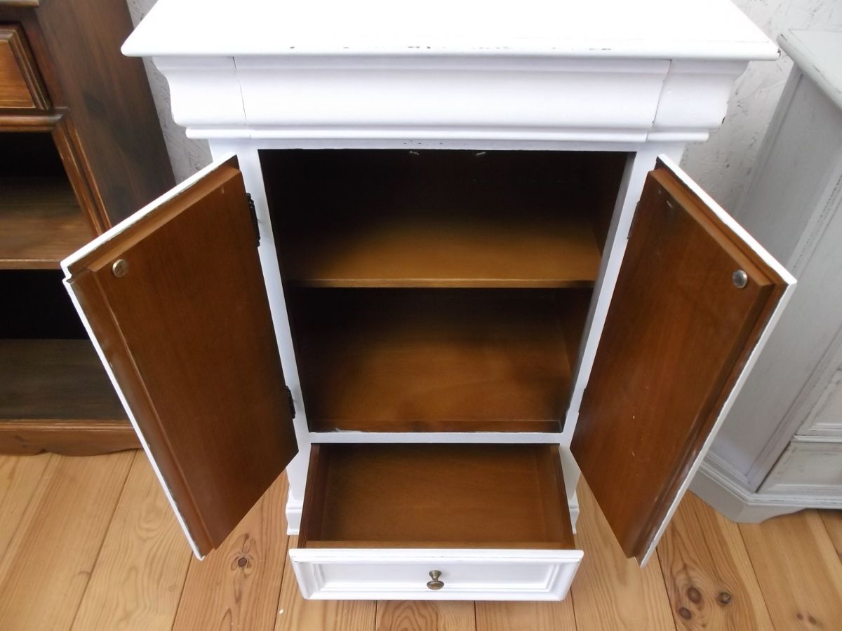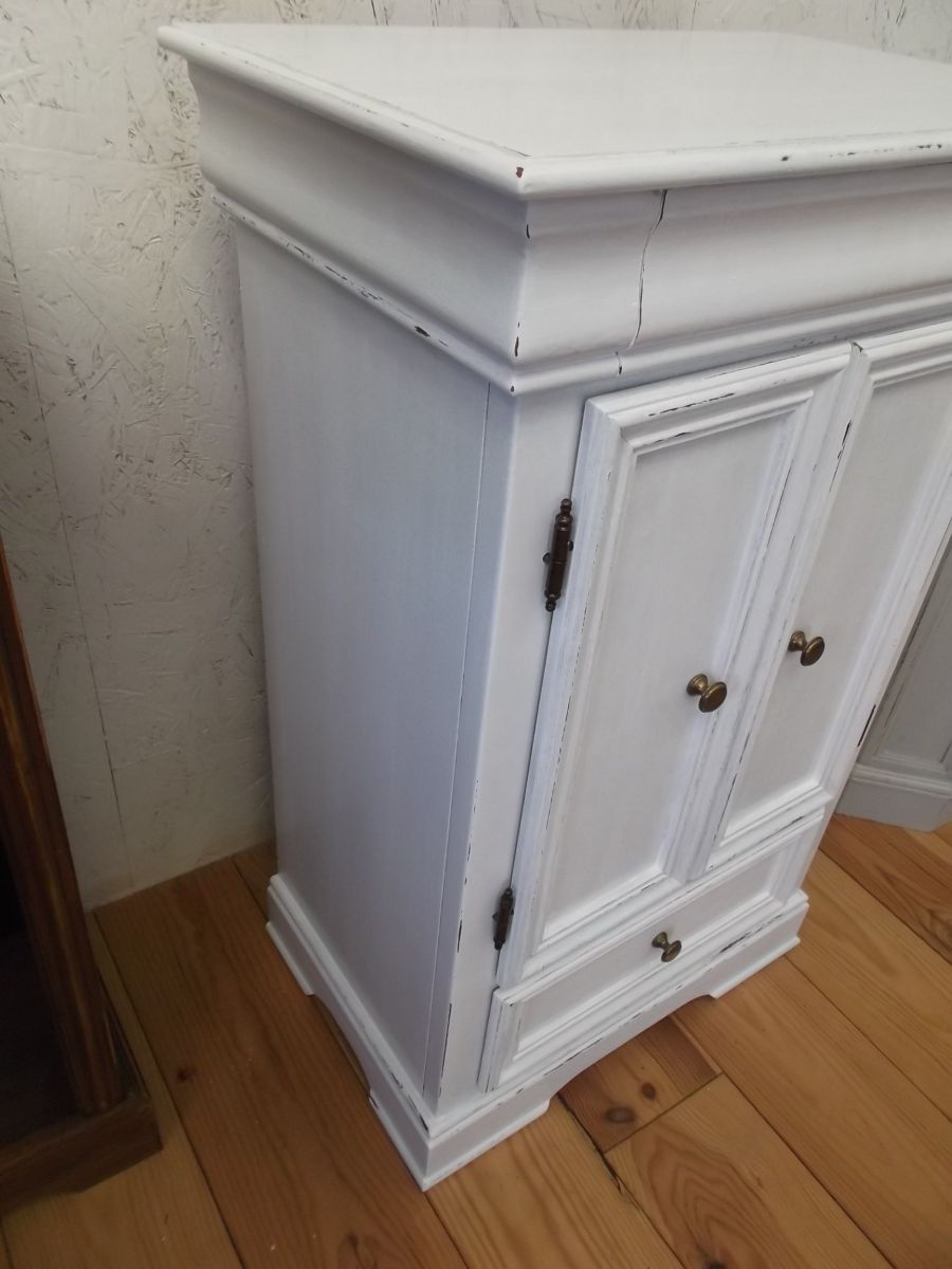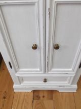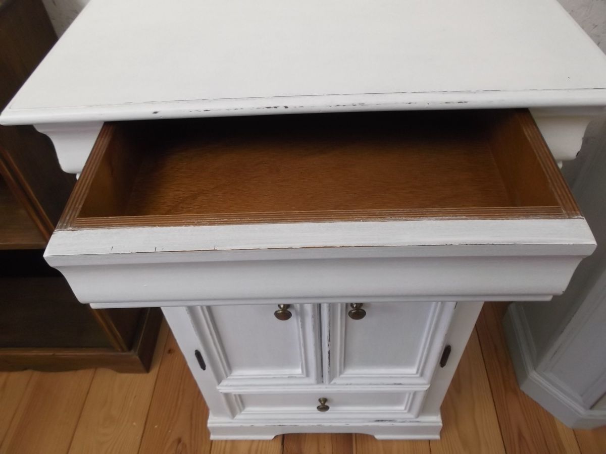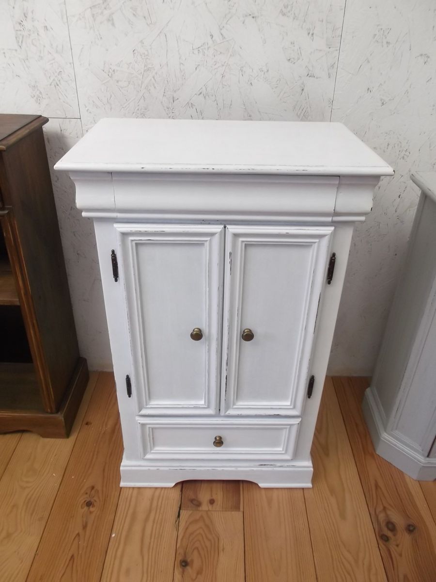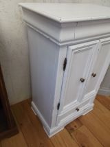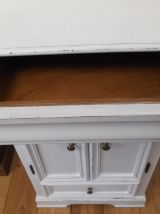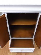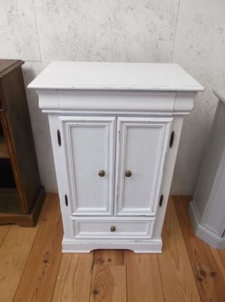 Meuble d 'appoint, en merisier, de couleur blanc, usé et vieilli, patiné, 1 étagére, 2 tiroir, 2 portes fermeture à aimant, chic, et raffiné, il s 'intégrera dans toutes les pieces de votre intérieur.
