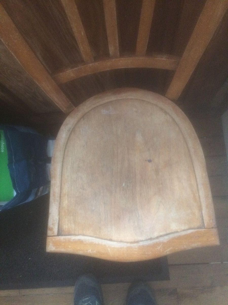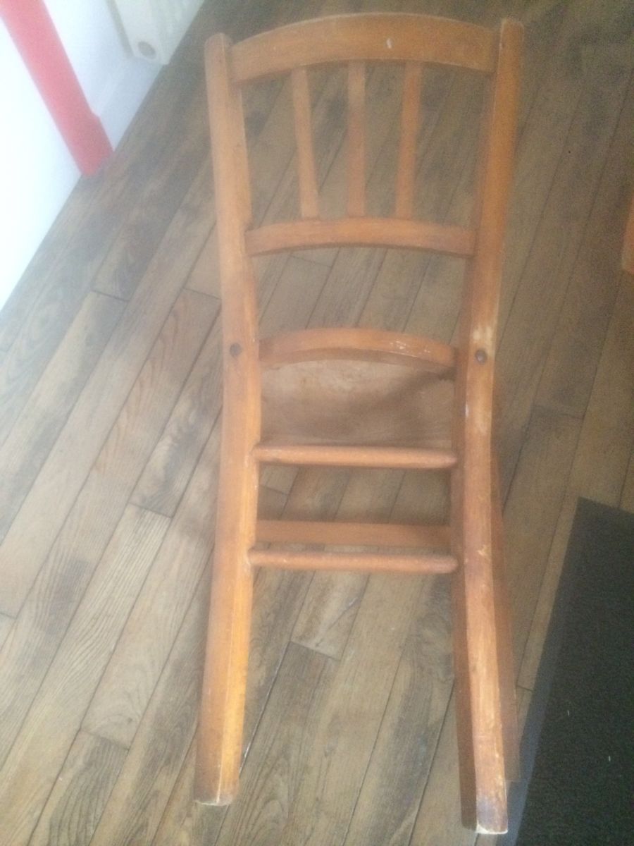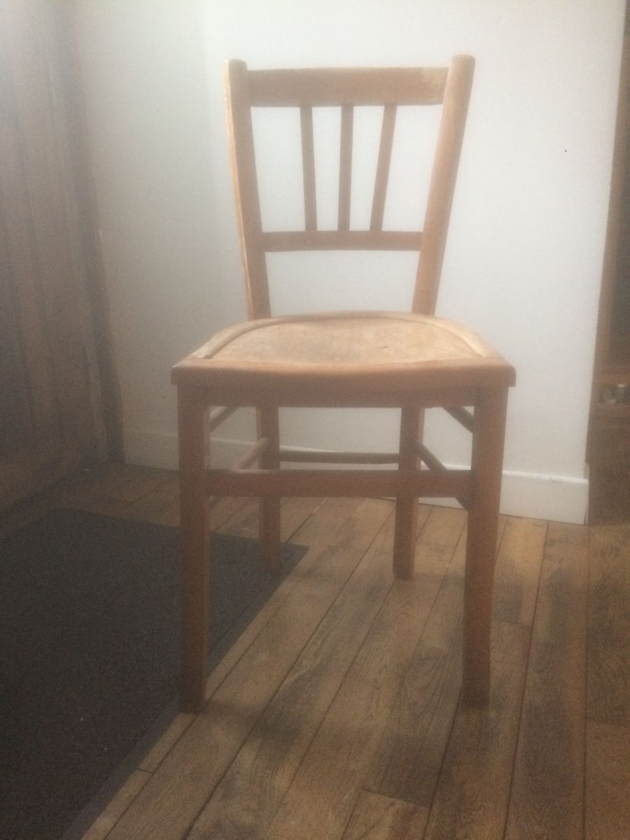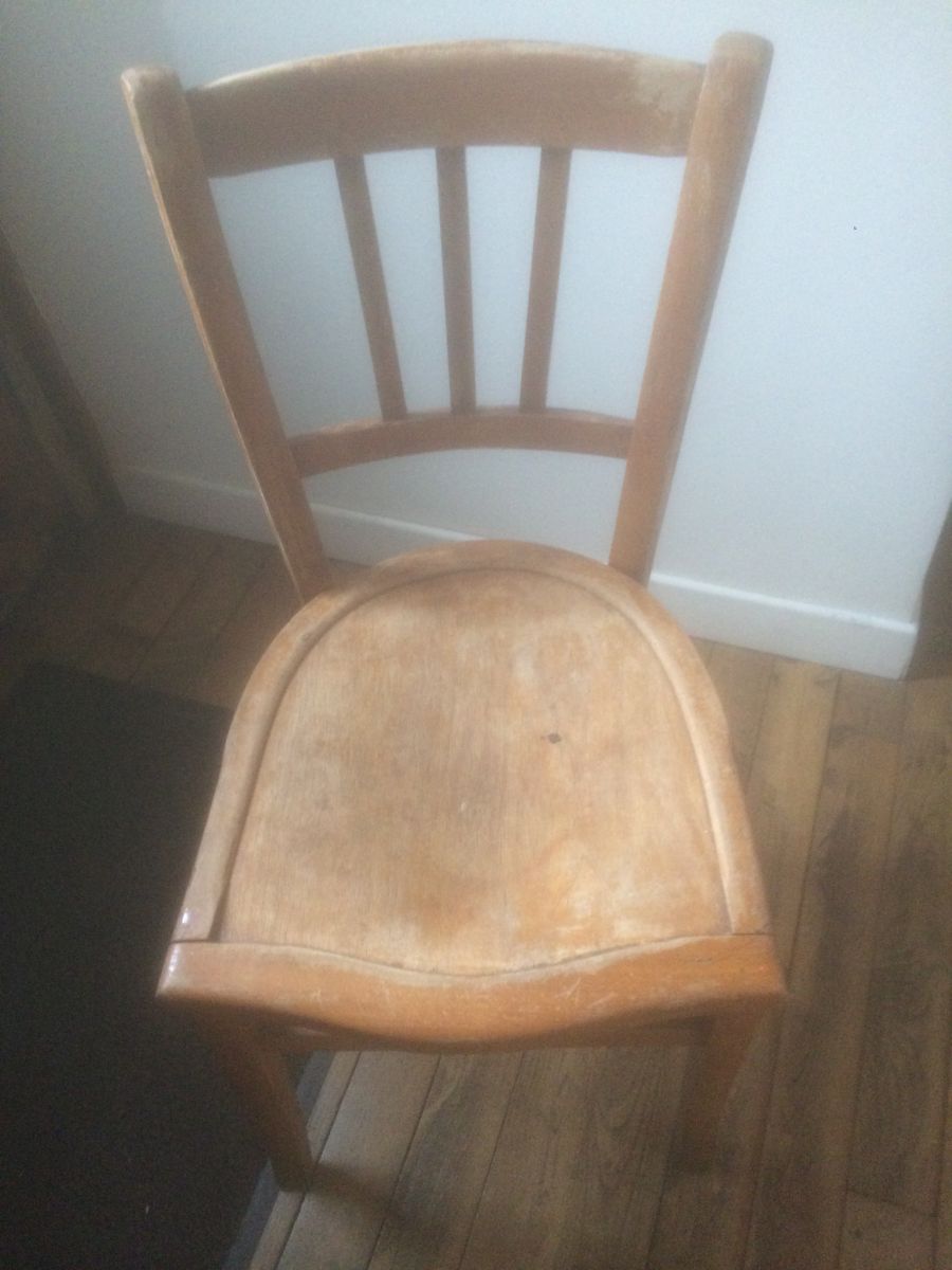 Chaise Bistrot, vernis usé mais bois en bon état;