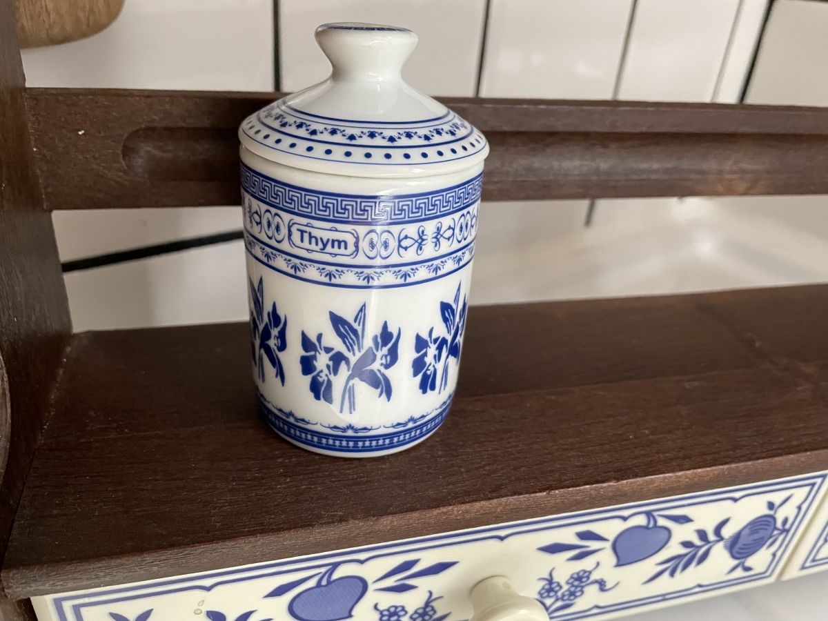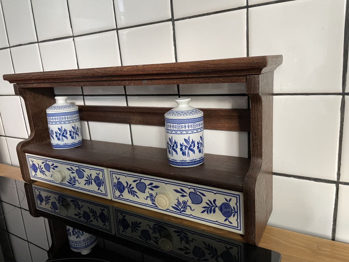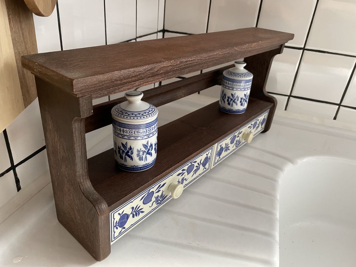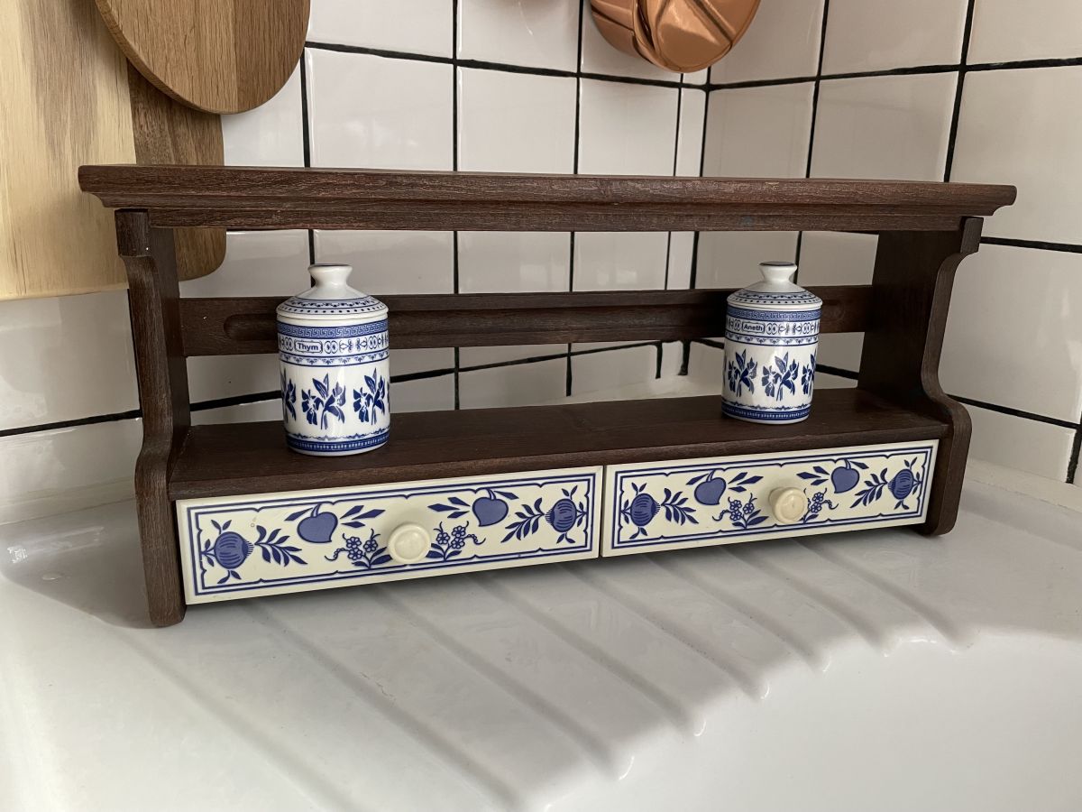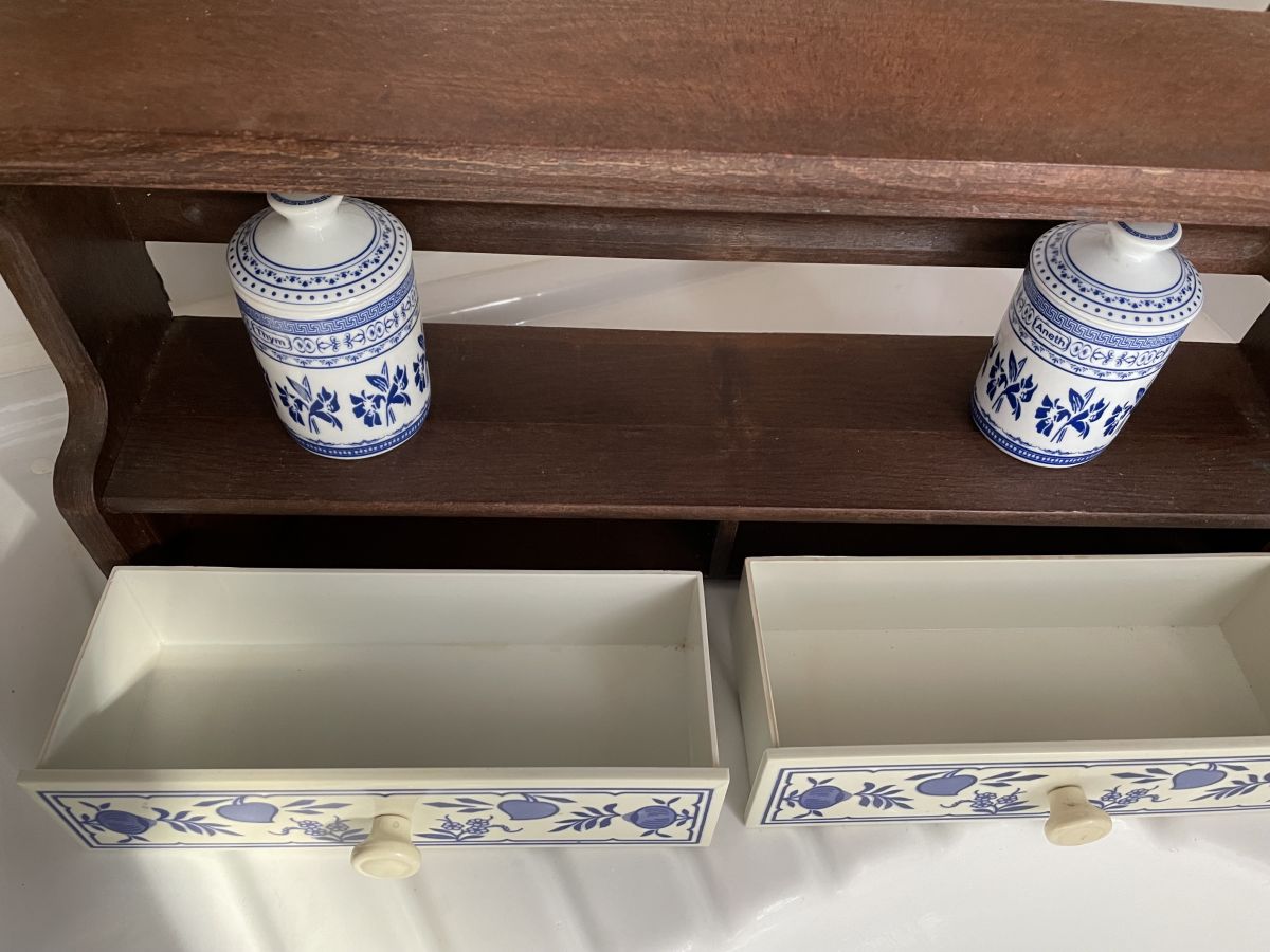Jolie étagère murale pour épices possédant 2 tiroirs en mélamine avec de très beaux motifs floraux bleus et 2 pots à épices en faïence .