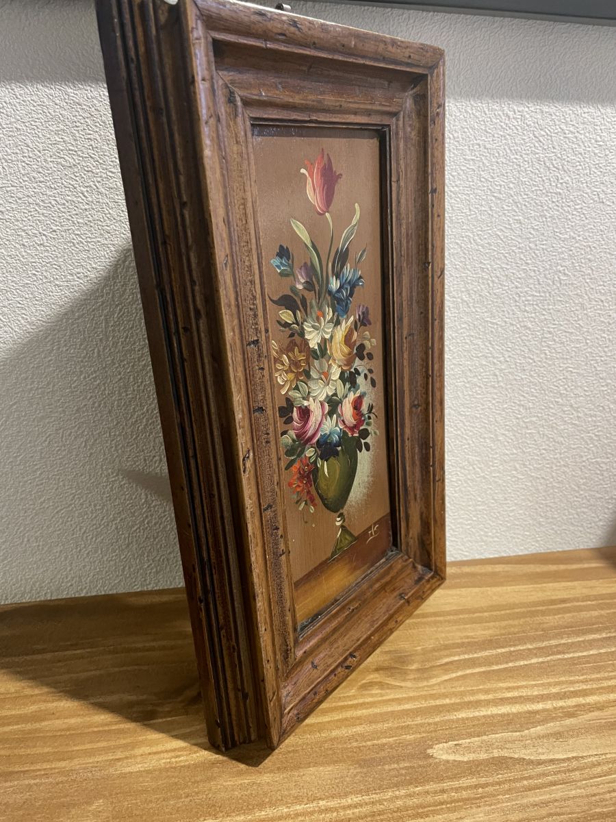 Très jolie huile sur bois représentant un bouquet de fleurs dans un vase. l'encadrement en bois massif est superbe et fait 4 cm d'épaisseur.