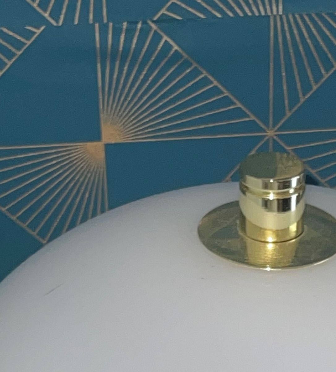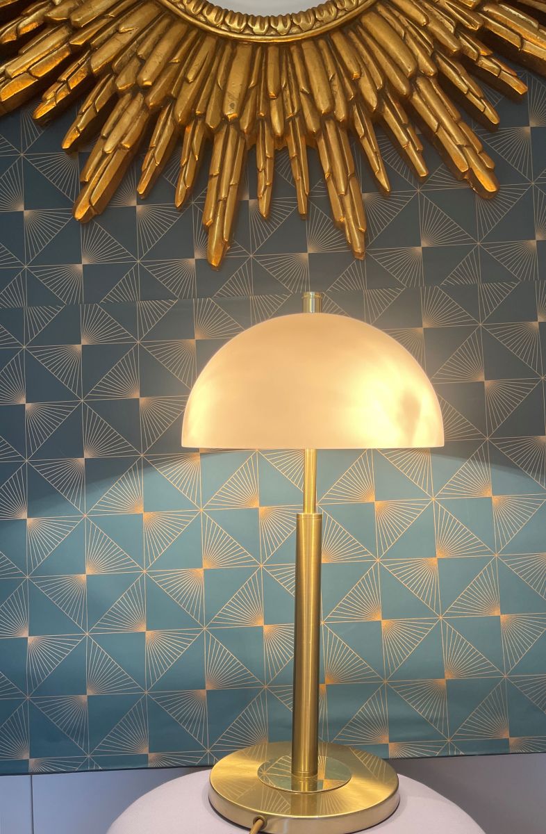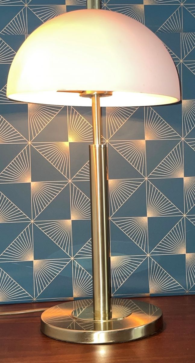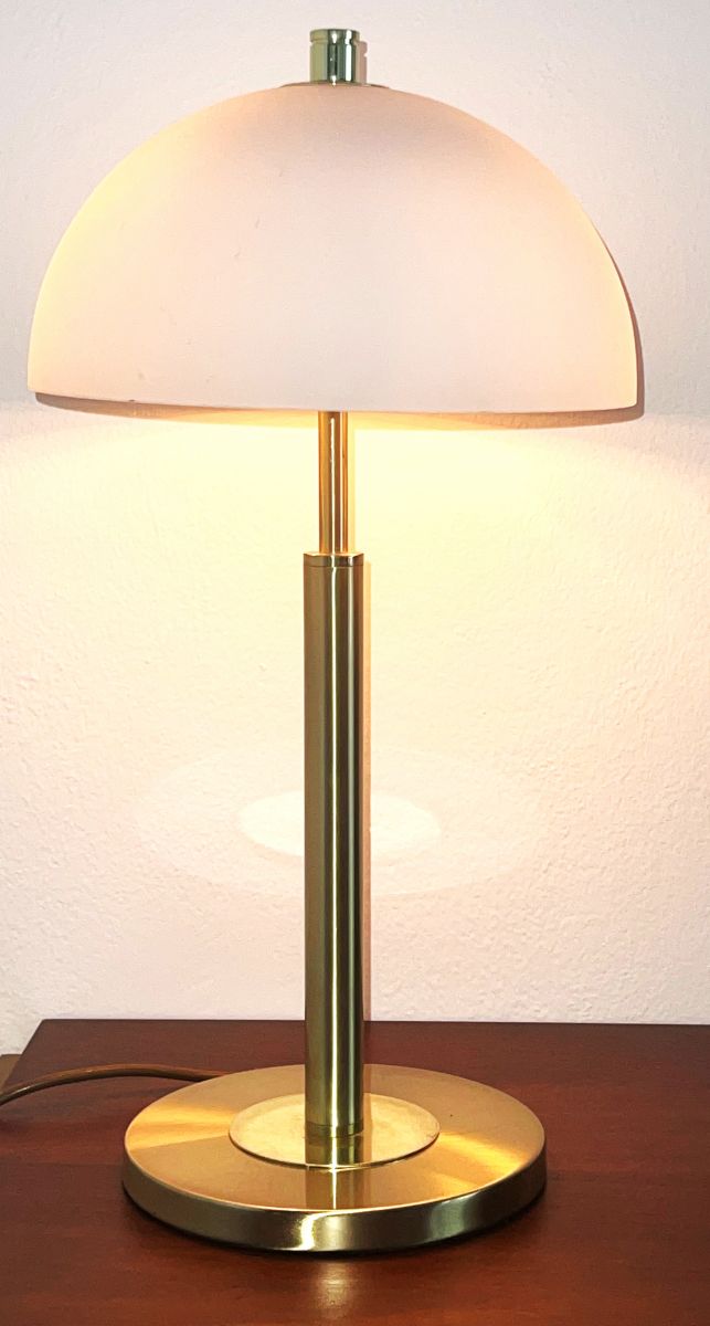Superbe lampe de style Bauhaus (modernisme années 30-40) en laiton massif, d’une brillance exceptionnelle. La coupole de verre est en opaline translucide et laisse passer une douce ou puissante lumière: 3 niveaux d’intensité reglables par simple pression des doigts sur le pied de lampe (tactile): Pas d’interrupteur