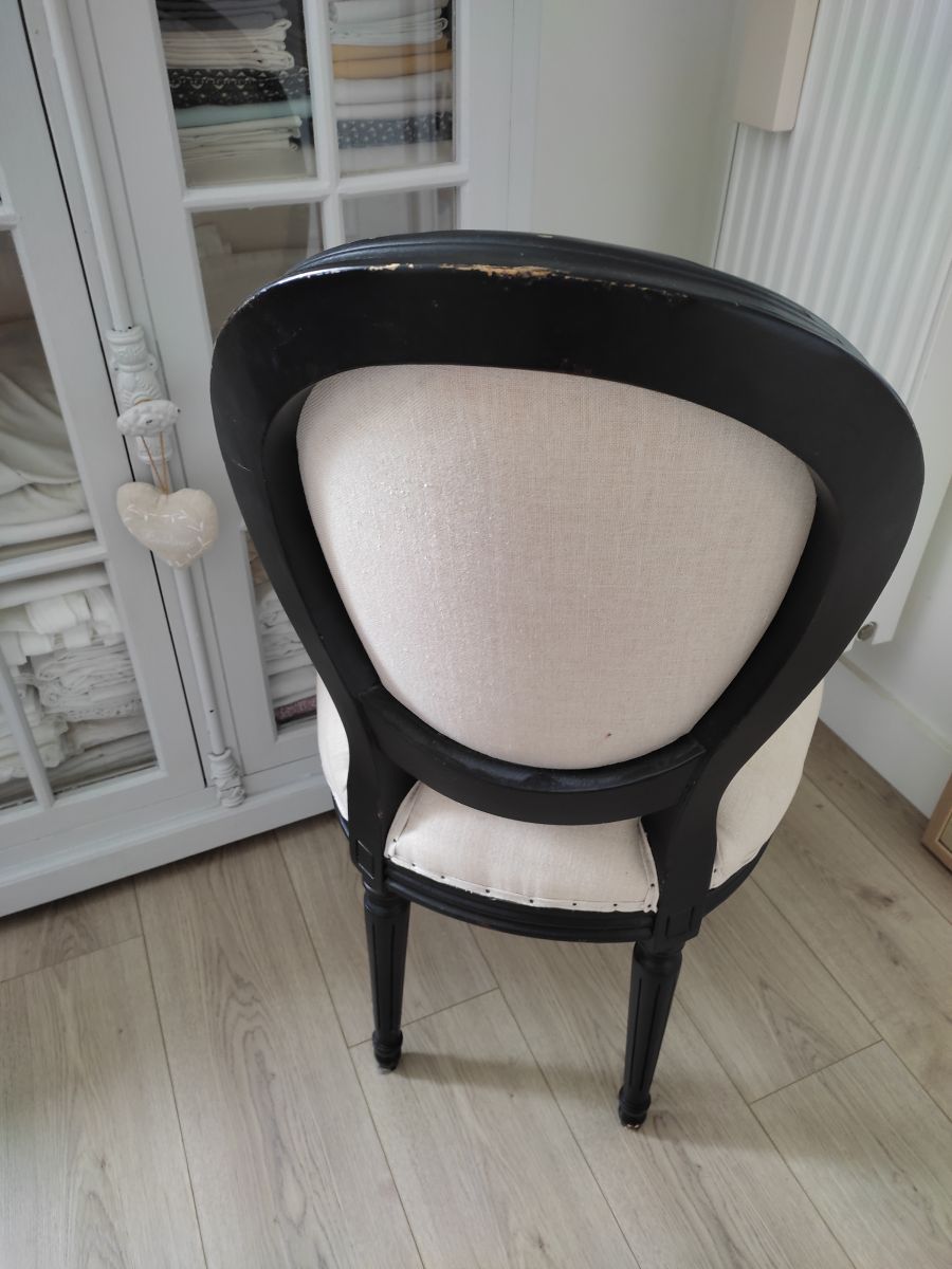 Chaise a rénover . Elle a une tâche d 'eau sur la toile en lin.