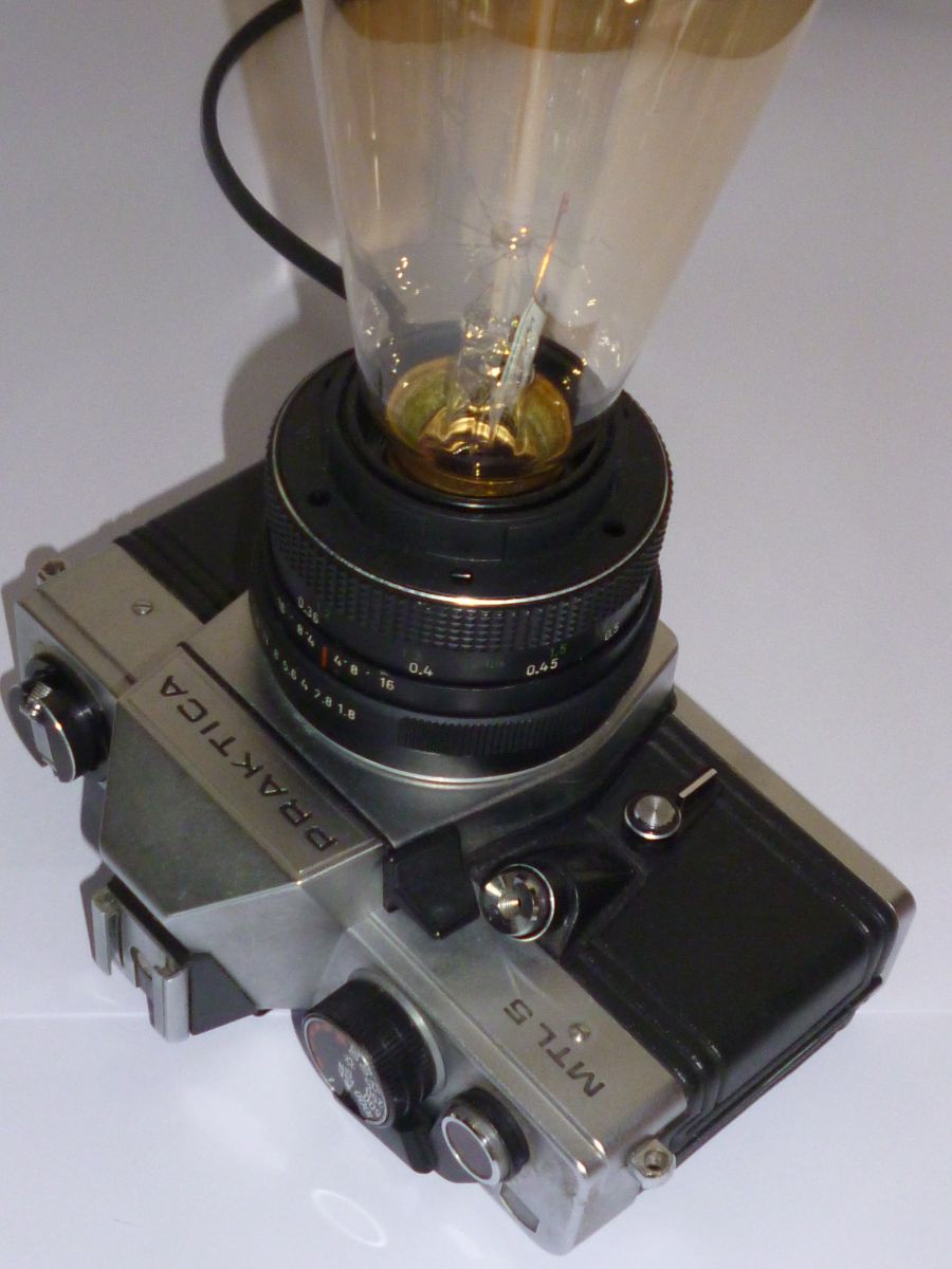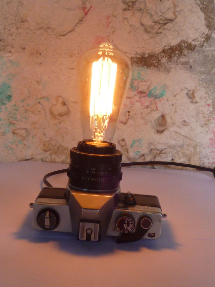 Lampe d'ambiance realisee a partir d'un appareil photo argentique " PRAKTICA MTL 5 " des annees 80 .