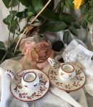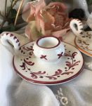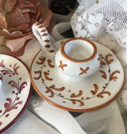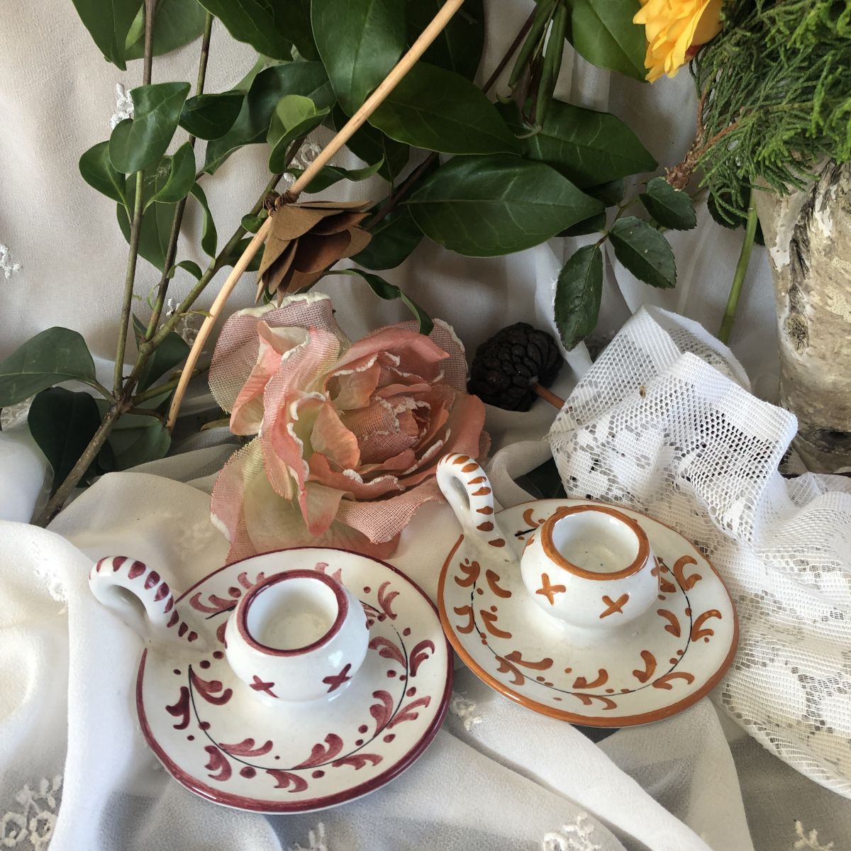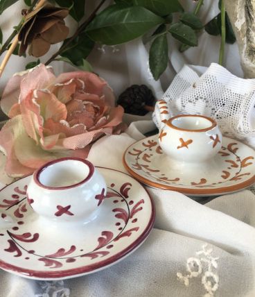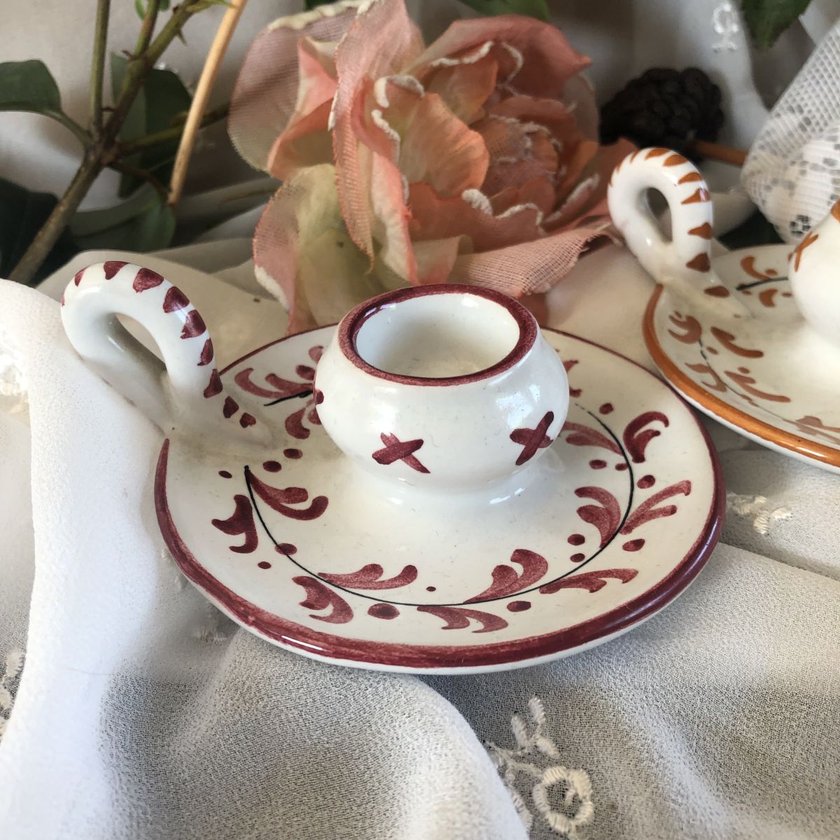 Ensemble de 2 bougeoirs à main en faïence dont 1 rouge et 1 orange.