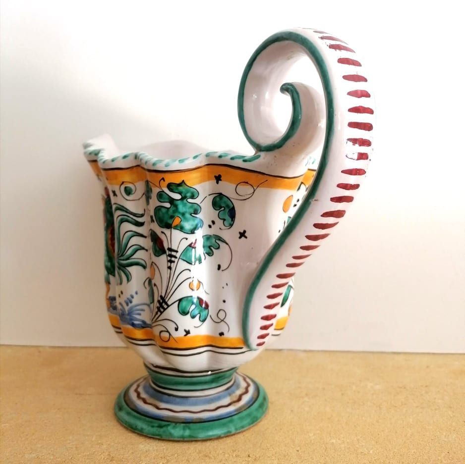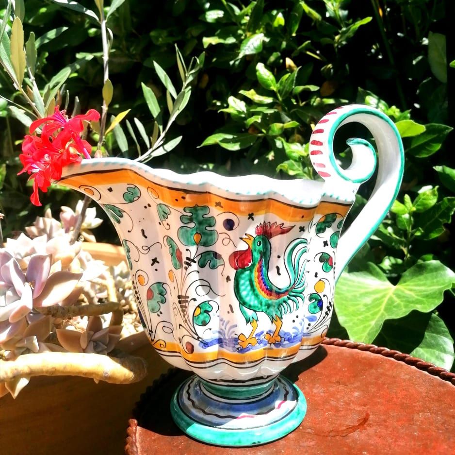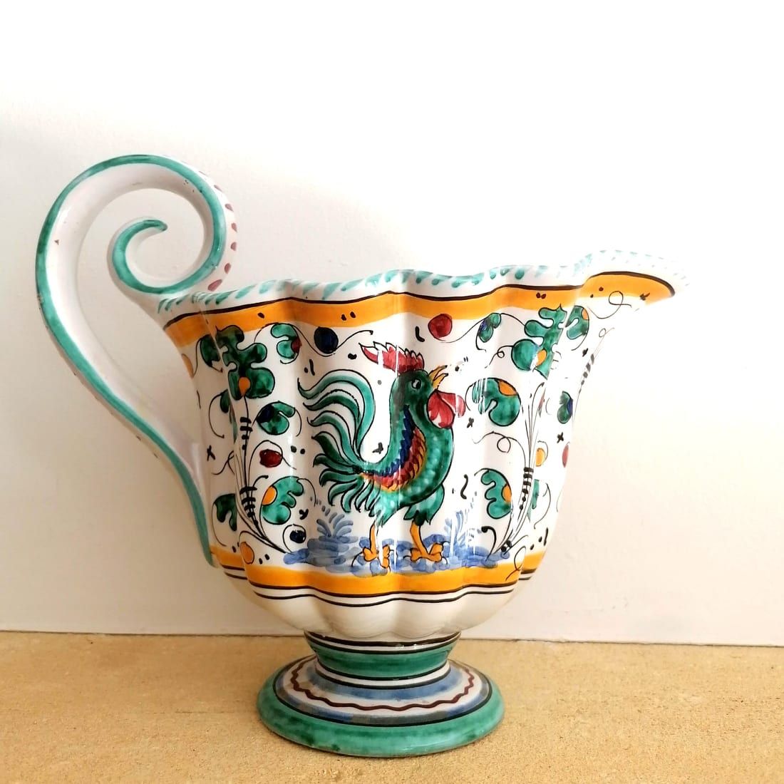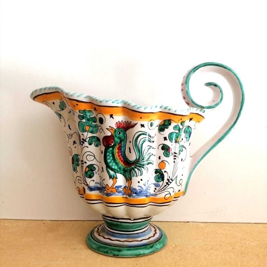 Aiguière en faïence émaillée polychrome reprenant le décor traditionnel de la faïence italienne. Décor représentant un coq entouré de feuillages.