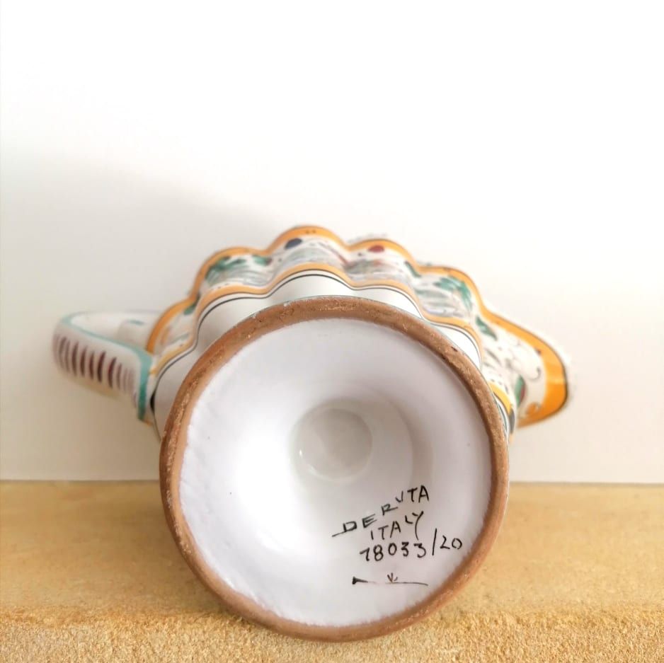 Travail du milieu du XXème siècle reprenant un décor traditionnel du XVIIème siècle. Car Deruta est un haut lieu de production de faïence depuis la renaissance, sa manufacture se situe près de Pérouse en Ombrie et ses productions traversent les siècles avec un grand succès.